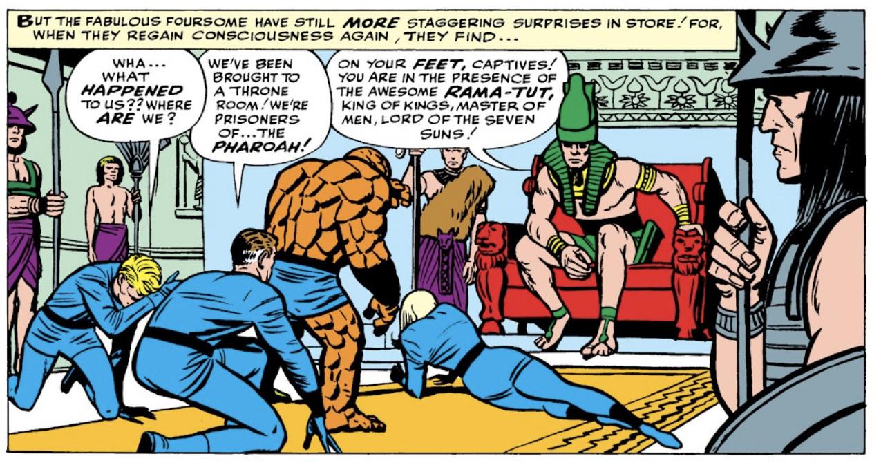 The first time that an iteration of Kang appeared in Marvel Comics was in 1963, in the pages of Fantastic Four no. 19, written and illustrated by the legendary duo of Stan Lee and Jack Kirby, respectively. Except Kang is never mentioned by name during this first appearance; the villain here is known as Rama-Tut, a robotics student named Nathaniel Richards from the year 3000 who has traveled back in time to ancient Egypt and established himself as a pharaoh. The Fantastic Four meet him, as they, too, have traveled back in time to ancient Egypt in search of a cure for blindness (just roll with it), and they are briefly captured by him before they manage to escape and send him fleeing back to the future.
