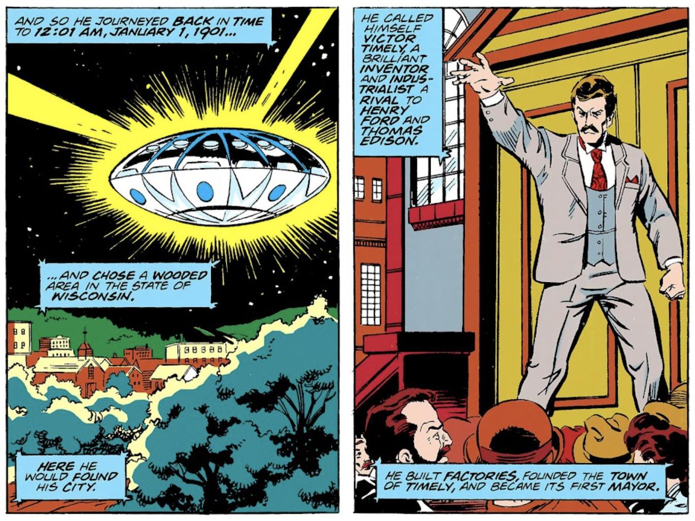 But more important than anything that Loki, Mobius, or even Timely says is the scene’s setting and the introduction of Timely in particular. The character made his first comics appearance in Avengers Annual no. 21 (published in 1992) as a version of Kang who traveled back in time to 1901 and founded a town in Wisconsin that he named Timely. (Along with the obvious reference to time in everything Kang-related, Timely is a reference to Timely Comics, the name of the publishing company that would eventually become Marvel Comics.) After taking on the name Victor Timely and establishing Timely Industries, Kang essentially uses this company to build the time travel technology that would grow and advance over generations to eventually allow Kang to be the so-called Master of Time in the first place. In a self-fulfilling way, it becomes ground zero for Kang’s empire.