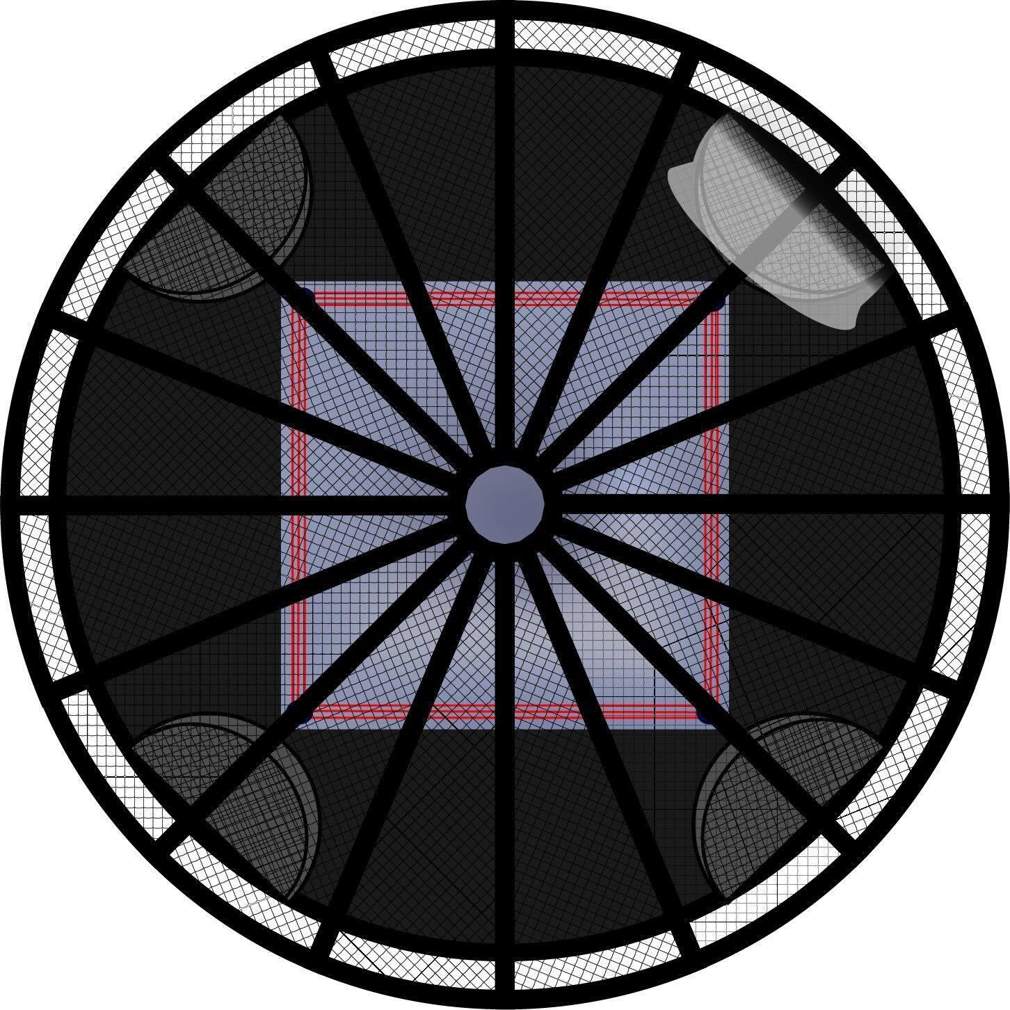 This is the original Elimination Chamber—there has since been an updated Chamber structure, first introduced in 2017 after a one-year hiatus for the concept—or at least a mediocre render of one. As you can see, the inner sanctum has four semicircular pods positioned at each corner of a ring placed centrally inside the circular superstructure. The spotlight at the top right represents the winner, which is a visual concept cribbed from WWE’s “selection” process for the next entrant in this version of the Elimination Chamber (which was replaced by LED light bars mounted to the roof of the chambers in the new iteration).