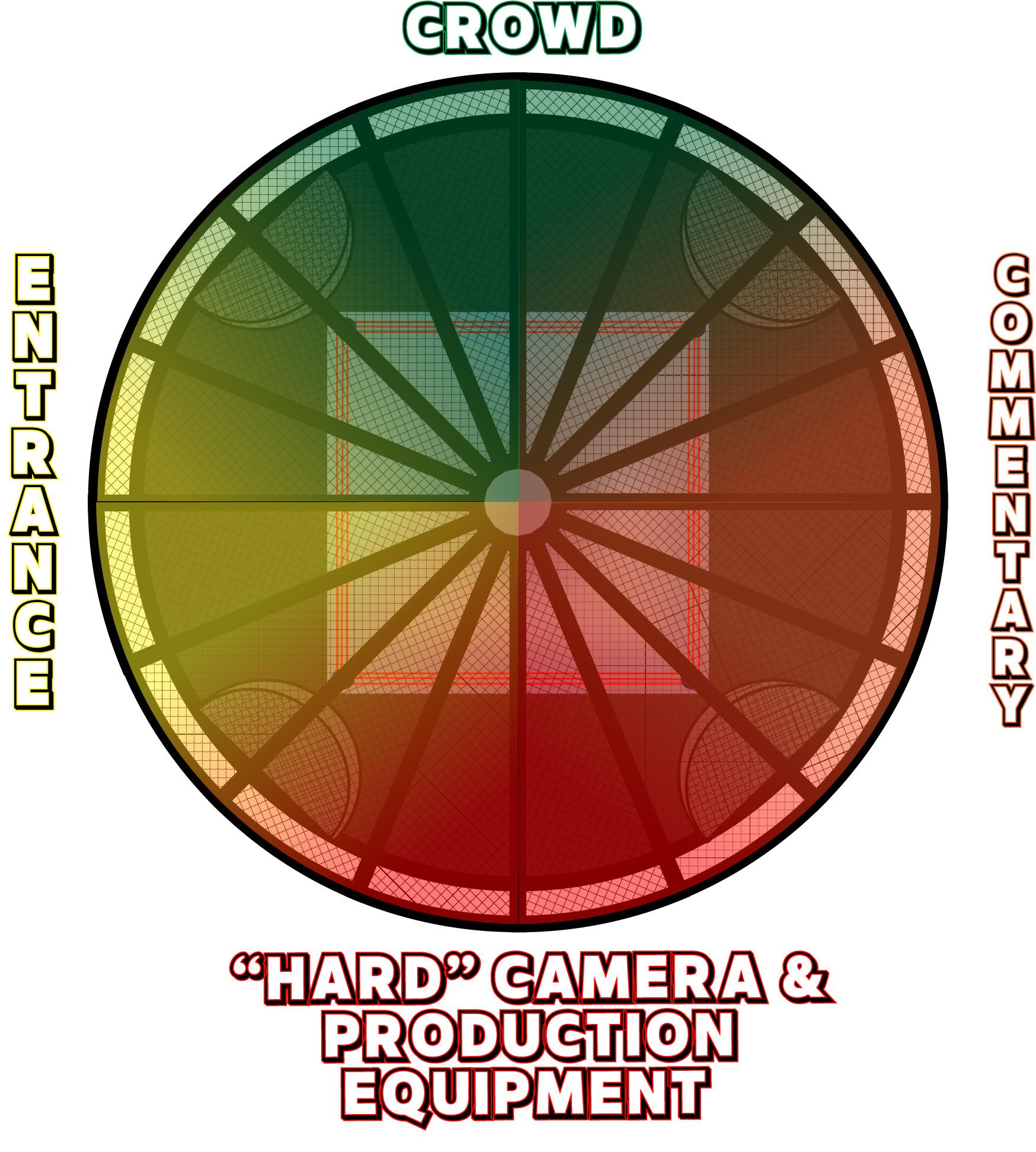 You may have intuited (especially if you didn’t have any strong interest in staring at camera equipment or Corey Graves’s wildly diminished suit game) how this poses a problem, both visually and logistically, for some of the pods/sections of the structure. This becomes even clearer if you split the chamber into “visual quadrants” based on the desirability of having the camera pointing at that side for an extended period of time: