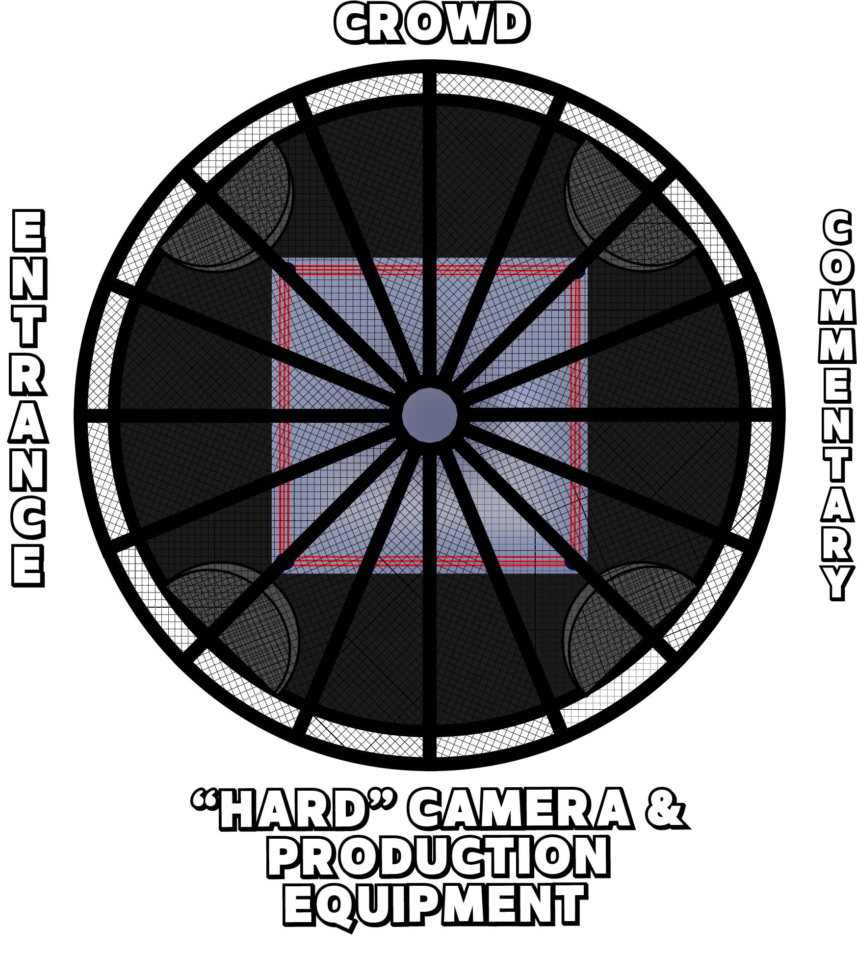 That’s because, on top of the original version of the Chamber being difficult to see through—which became much less of an issue starting in 2008, thankfully—unfortunately for WWE, in most other buildings in which they perform, the lower and upper bowls (as opposed to the moveable floor seats they add) usually prevent this kind of framing (an issue that would at least partially lead to the redesign 15 years after the first match). As such, for literally every other arena WWE has worked in over the last 30 years (at least when fans were present), the ring has a specific layout for how the show is presented from a structural and production perspective, that looks something like this: