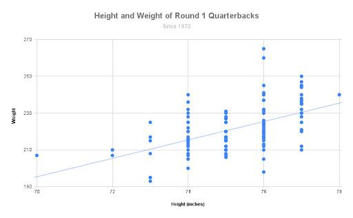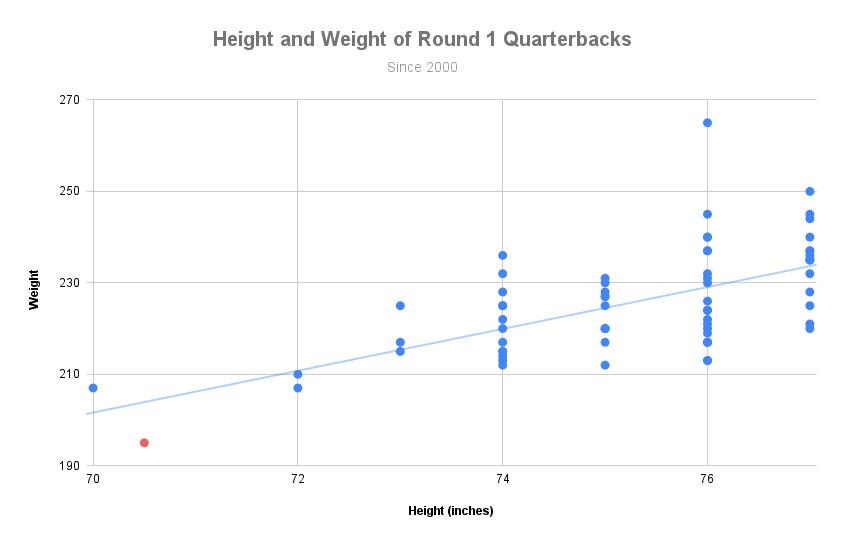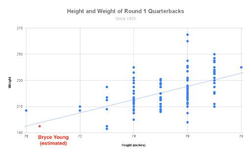 Height is only half of the equation for Young. Here’s all of those first-round quarterbacks, graphed by height (in inches) and weight.