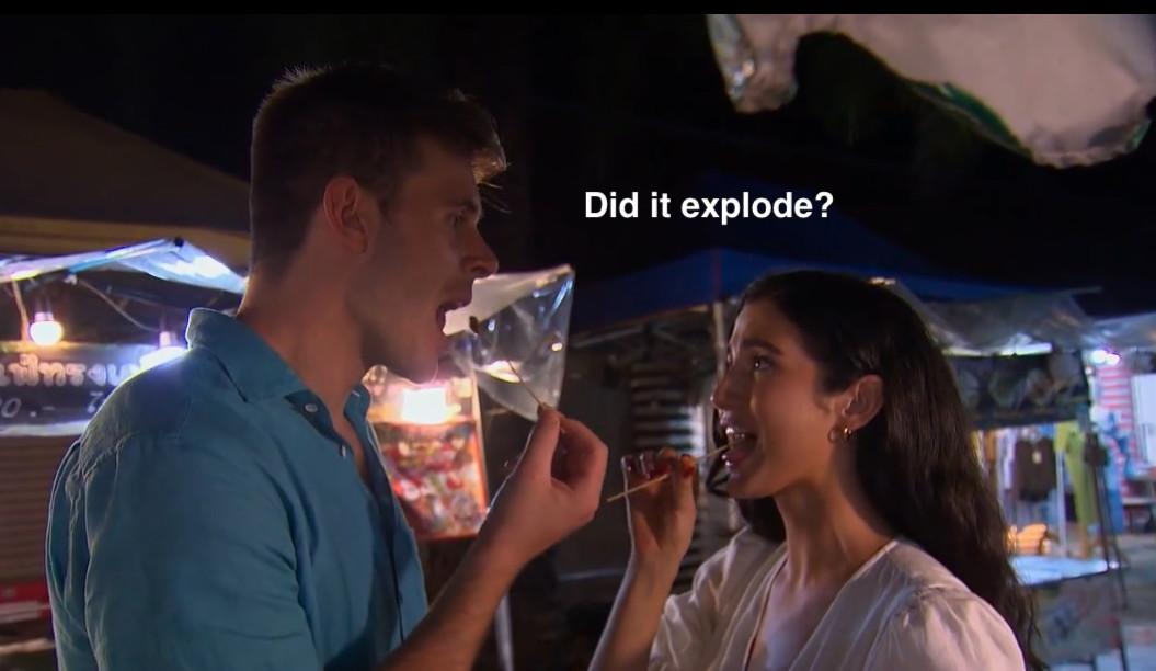 Zach and Ariel love to eat. It’s their thing! After Ariel took Zach on a stomach-destroying NYC food tour during her hometown date last episode, he surprises her with an evening excursion to a night market, where they truly go for it. They eat bugs and intestines and a variety of raw seafood—and engage in some vigorous PDA through it all. They kiss after ingesting exploding grubs; they make out with sushi still in their mouths.