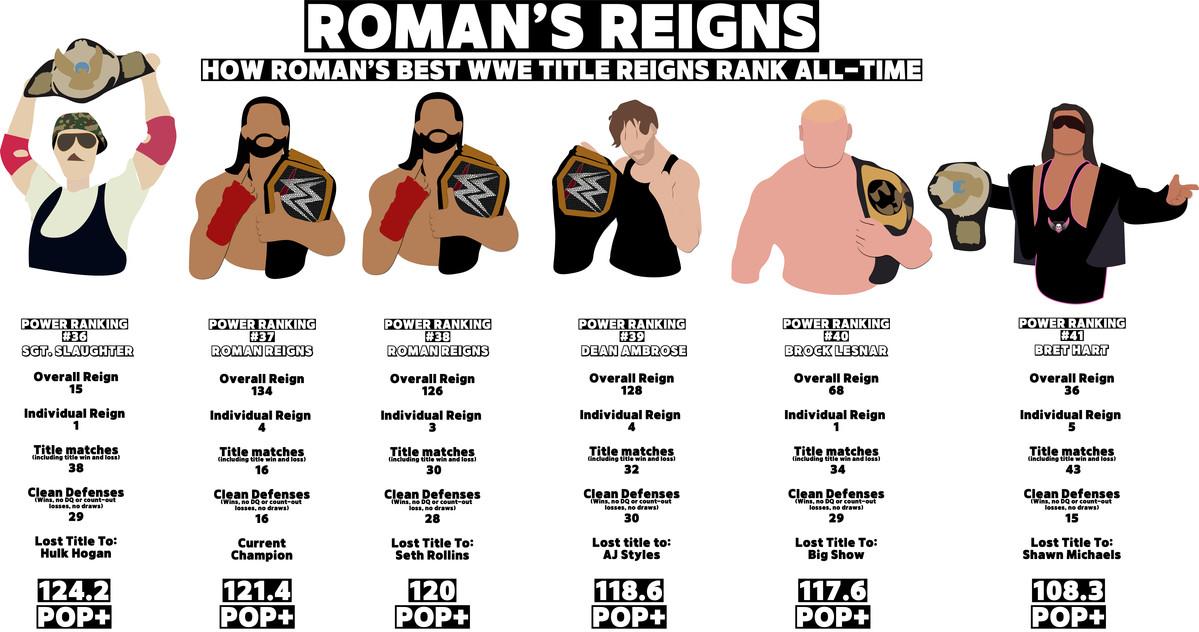 However, even after the Universal title reign is added onto the beginning of Reigns’s title reign—which would be a wild way to measure the relative value of his WWE title run, roughly equivalent to counting Shohei Ohtani’s hits in his Cy Young case—it wouldn’t be considered the most dominant title run in the last 10 years when run though our Power Board rankings formula. That Frankenstein’s monster version of a WWE title run would definitely be in the conversation for among the best of all time, though.