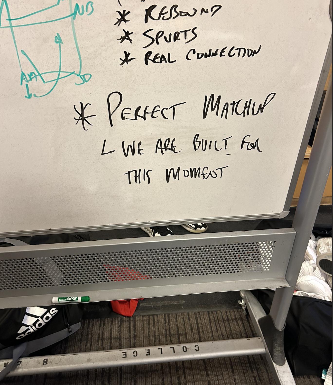 But FAU’s players and coaches were relatively calm after the win. I watched sophomore guard Johnell Davis quietly tie a piece of net to the adjustable strap on his Final Four hat and ensure that a student manager got a picture with the East regional trophy—the practiced moves of a vet who had been here before, even though FAU certainly hadn’t. The Owls seemed surprised when people like me came up and asked whether they’d believed all along they had a Final Four run in them. And on the locker room whiteboard, scrawled in dry-erase marker next to a handful of play designs, was a phrase showing what FAU’s players and coaches thought they were capable of: WE ARE BUILT FOR THIS MOMENT.