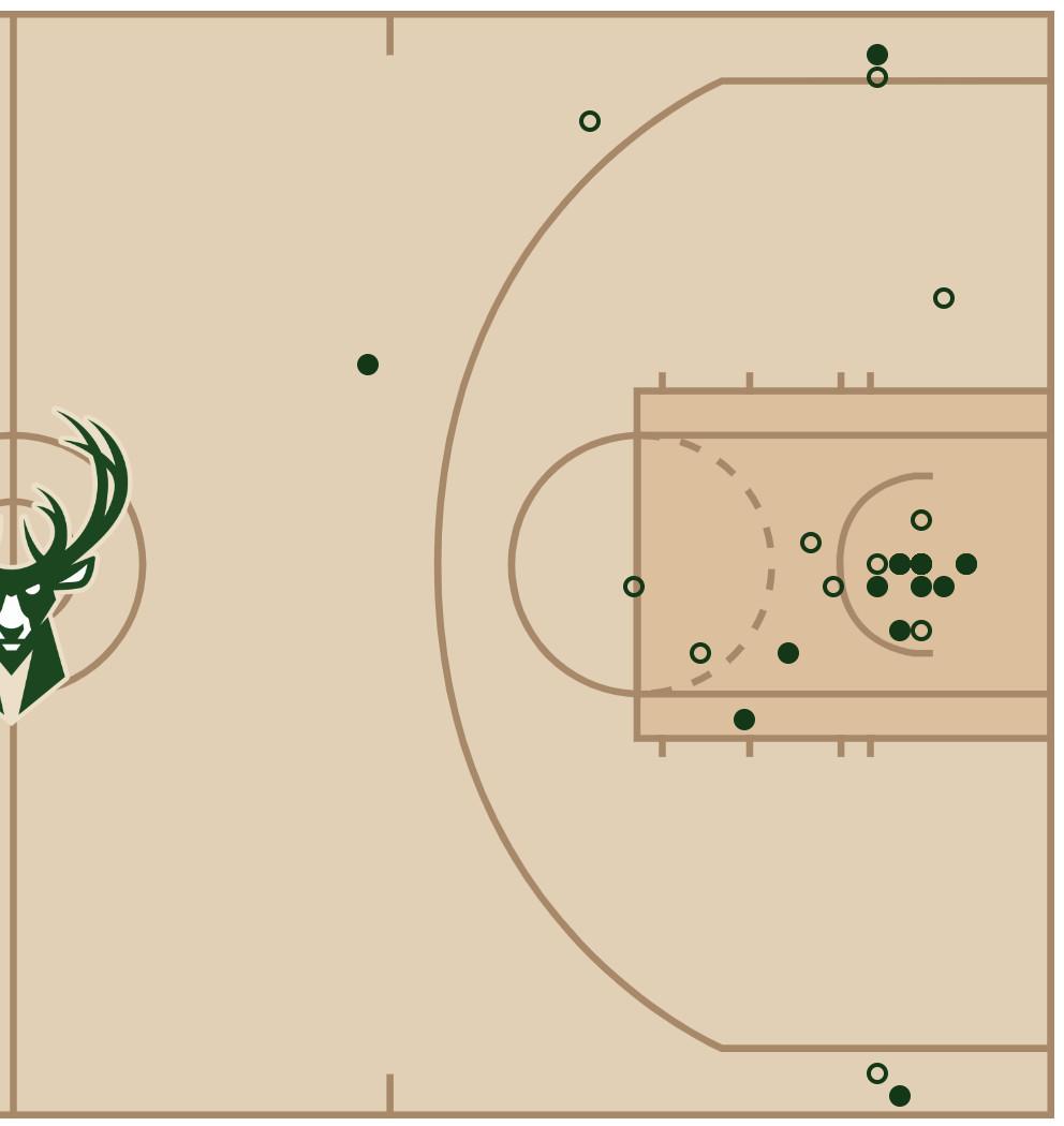 Look at Milwaukee’s first-quarter shot chart, and it’s clear that the Bucks were able to successfully navigate wherever they wanted on offense even without their best scorer and two-time MVP: