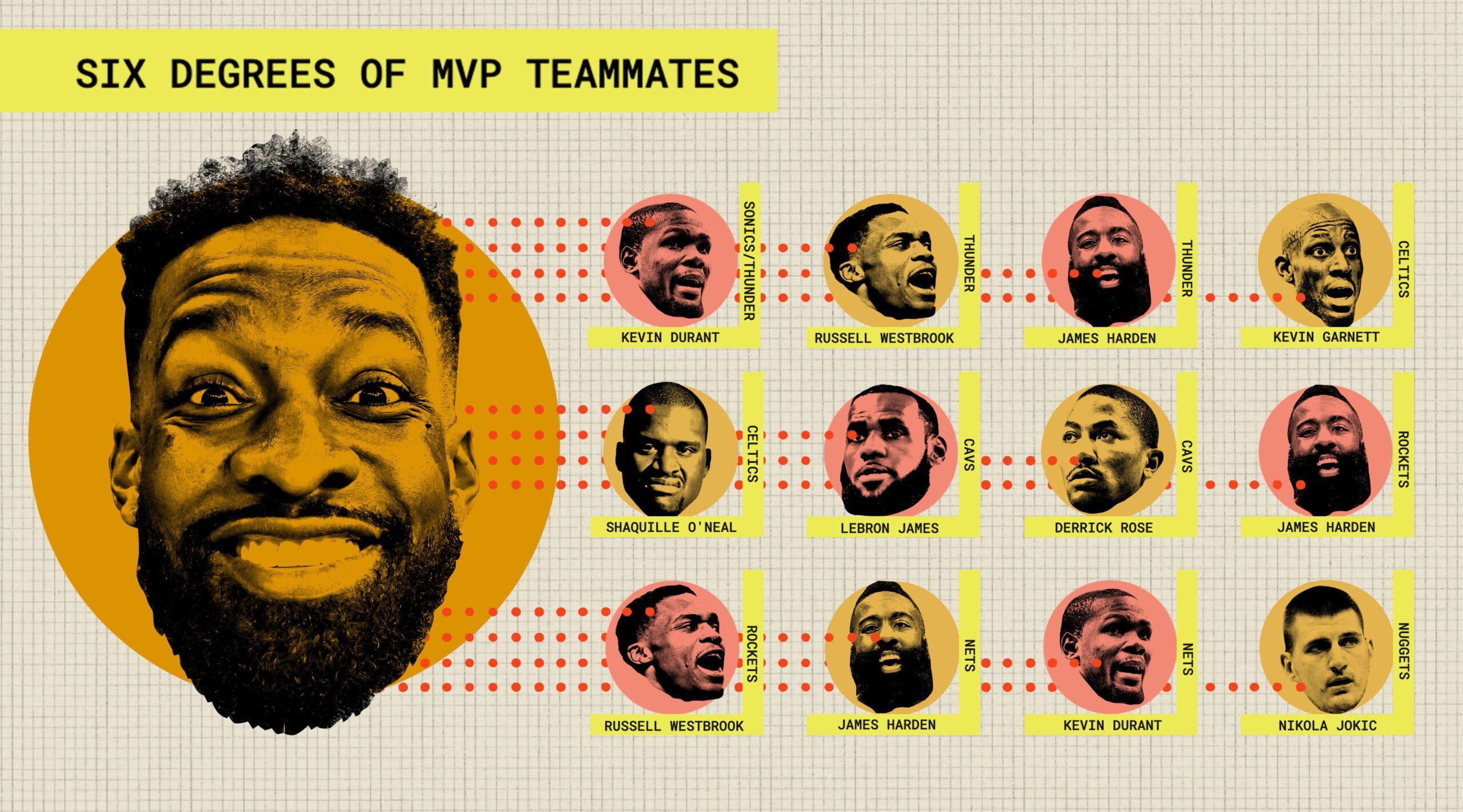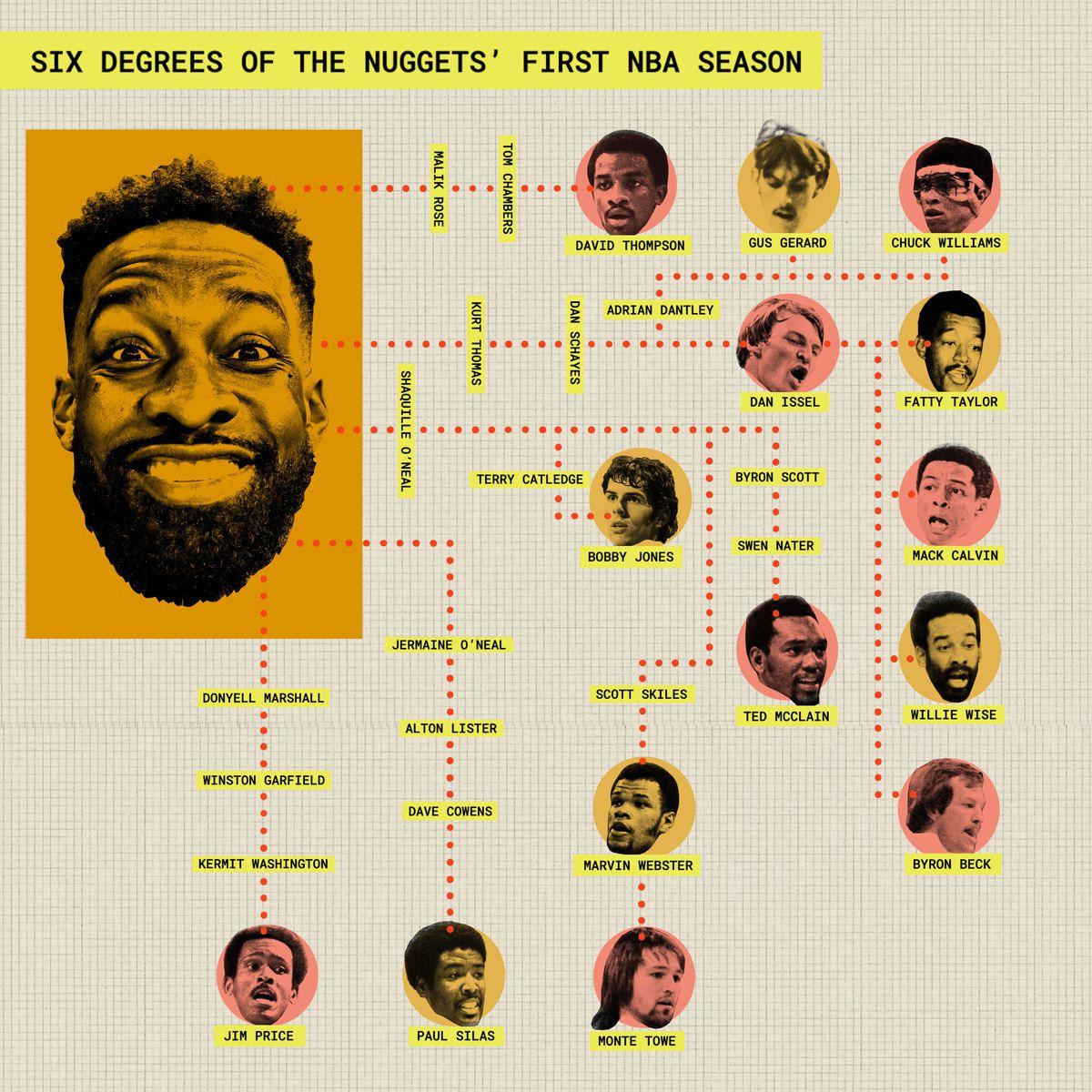 Every member of the NBA’s 75th anniversary team—which was created to honor the 76* greatest players the league has ever seen (and somehow doesn’t include Jokic)—falls within six degrees of Green, and most in far fewer than that. George Mikan is the only player on the list who is even five degrees away, according to the NBA Degrees of Separation tool developed by Rob Misiorowski. You can connect Green to Jerry West in three teammates; to George Gervin in two; and to Michael Jordan in one. (Both played with power forward/poet Etan Thomas.)