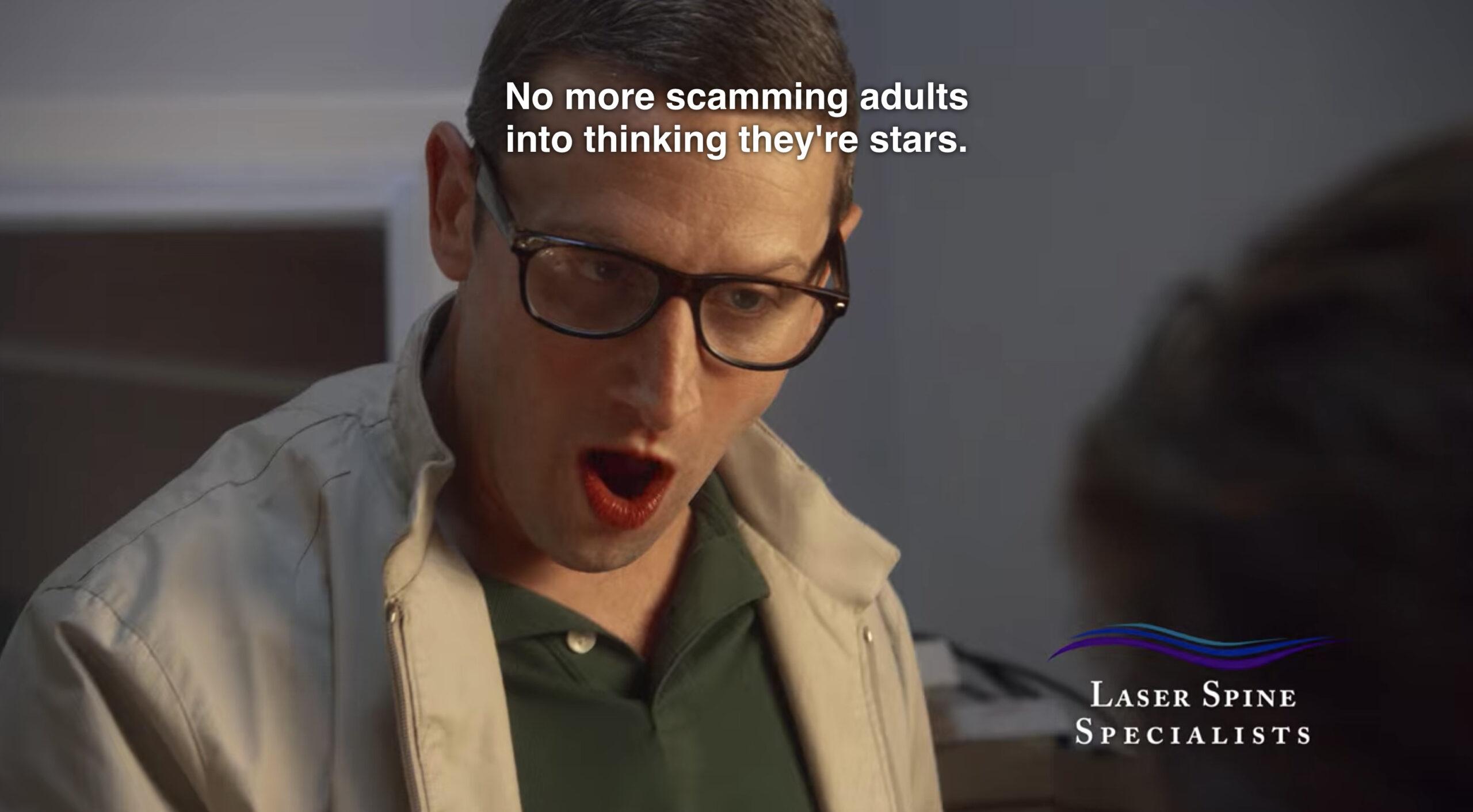 It seems like one of those medical ads you see on TV all the time, until Tim Robinson shows up and escalates in the most unexpected ways. First, Laser Spine Specialists have given his character the renewed strength to fight his wife’s new husband, Danny Crouse. Then he testifies to being able to lift his adult son over his head (“And there ain’t shit he can do about it”). Finally, in a truly sublime turn, the advertisement basically stops altogether and turns into a pastiche of a man confronting a sleazy record producer (Robbie Star from Superstar Tracks Records) who’s bilked him out of thousands of dollars.