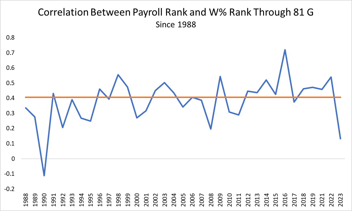 As Neil Paine noted last month, we can quantify how tenuous the link between dollars and dubs has been. After Saturday’s slate, all 30 teams had played at least 81 games, or half of their regular-season schedules. The graph below shows the yearly correlations between payroll rank and winning-percentage rank through each team’s first 81 games, beginning in 1991 (excluding the pandemic-shortened 2020 season). Correlations range from -1 (a perfect inverse correlation) to 1 (a perfect positive correlation). The higher the positive correlation, the stronger the relationship between two variables—in this case, where a team’s spending ranks and where a team’s winning ranks. The red line represents the median yearly correlation over these 32 seasons.