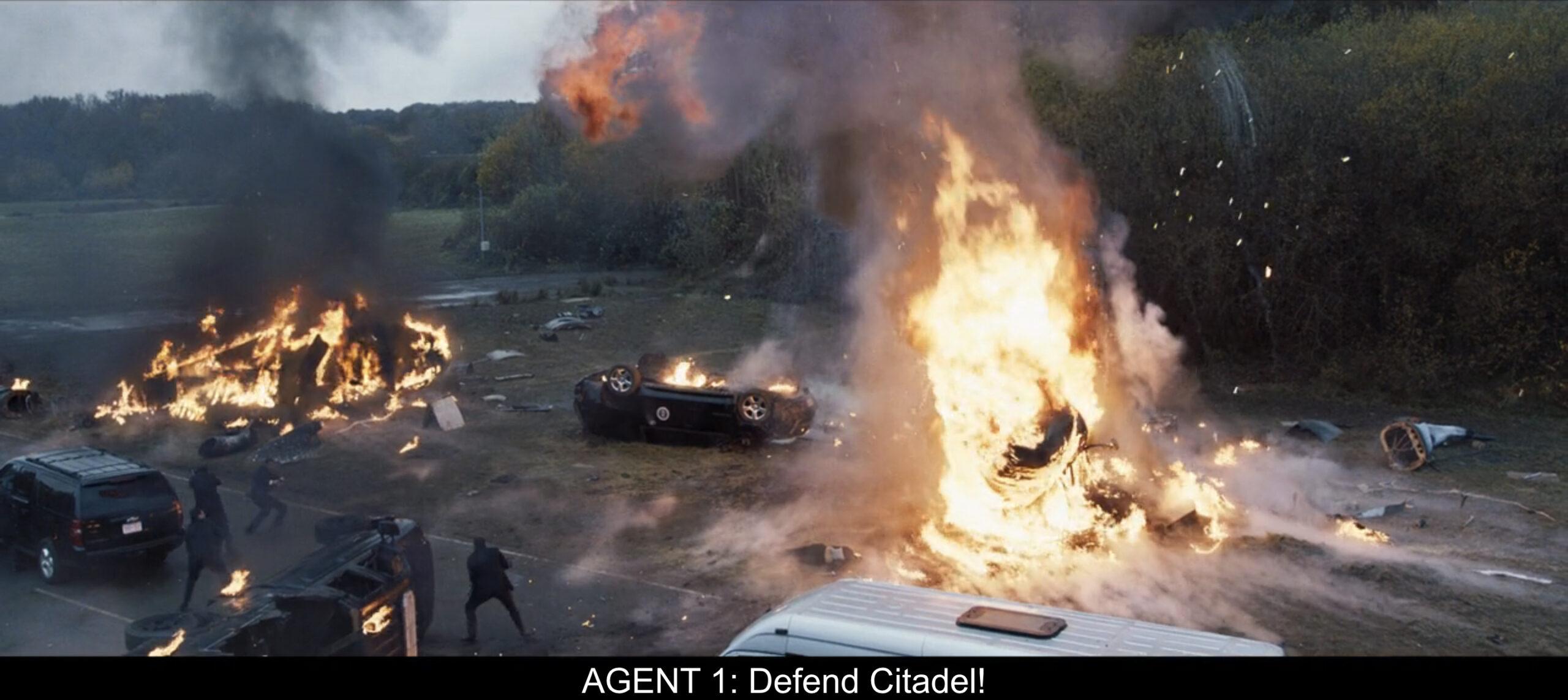 Despite the fact that the safety of the president is the Americans’ top priority, no soldier or agent makes an effort to save him until Fury and Talos arrive to help out. (Mind you, Fury is still a wanted man in the U.S. and the world at large, yet he’s still treated as a commanding officer.) President Ritson has been unconscious, hanging upside down in a flaming car, for minutes at this point. Now, I’m no military expert, but I don’t think the president looks very safe in his current predicament: