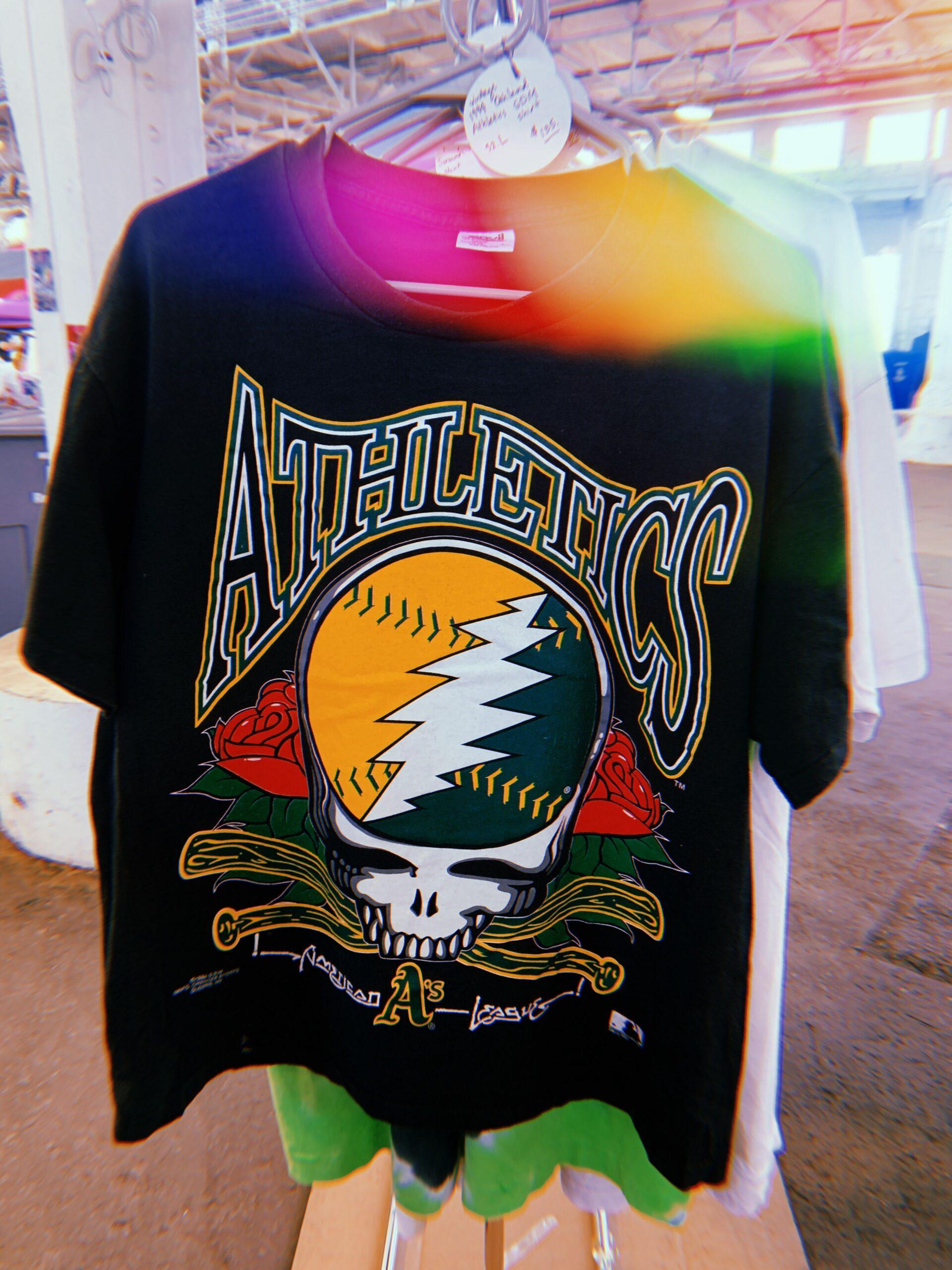 But mostly there is versioning. In the same way that a dub producer takes the elements of a traditional reggae track and reframes it into something more wigged out, artists have been fucking with the iconography of the Grateful Dead and selling it back to Deadheads for decades. A pre-fame Keith Haring sold shirts on the lot in 1977, his characteristic line work already apparent in the doodles that fill the blank space in the Stealie. A guy calling himself New Springfield Boogie exclusively makes merch that references both the Dead and The Simpsons, and with the charisma of Lyle Lanley selling Springfield on the Monorail, he gleefully shares the names of his creations. Homer disappearing into the roses of the band’s Bertha skeleton is given the “St. Stephen”–referencing title “In and Out of the Garden He Goes.”