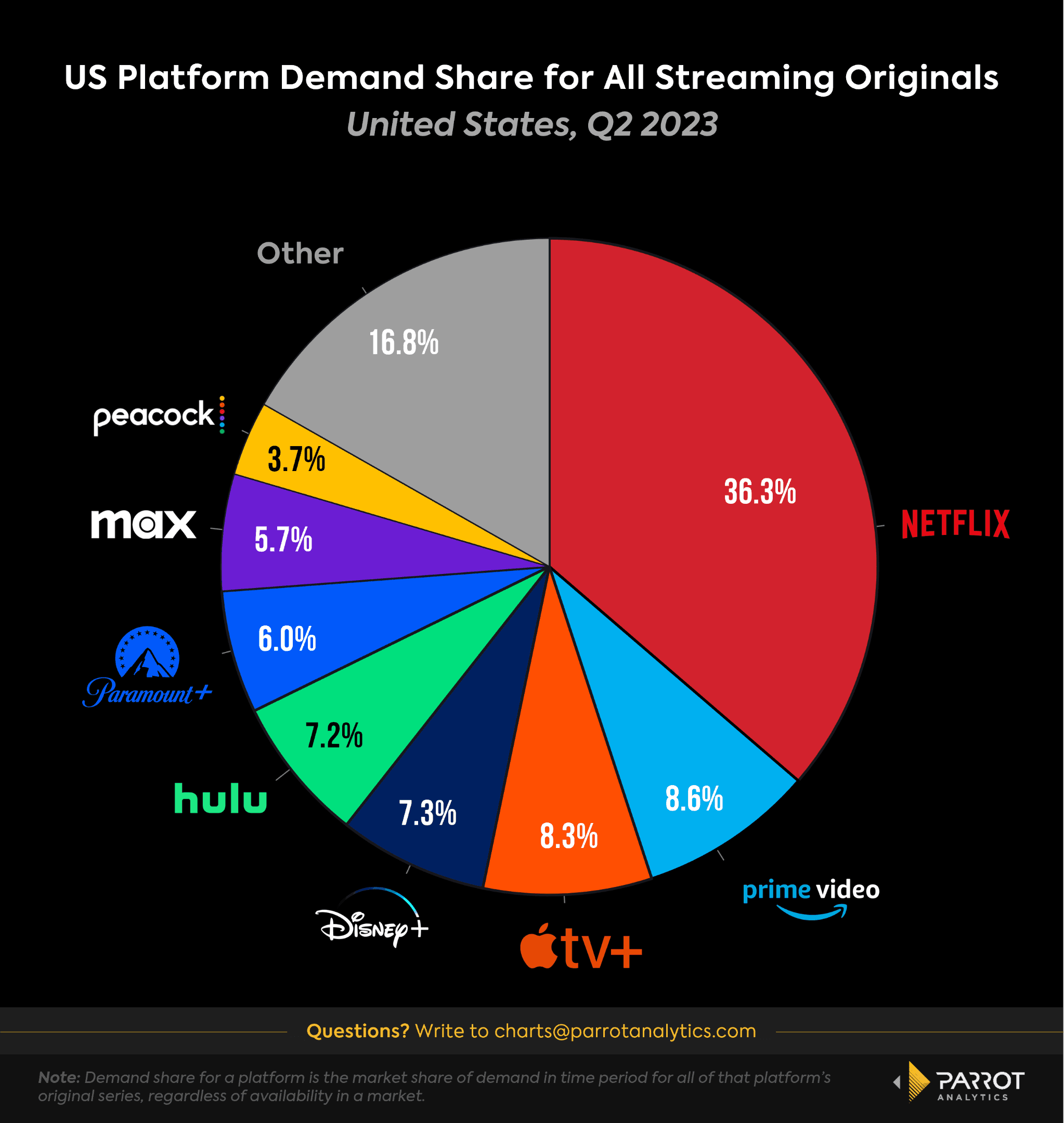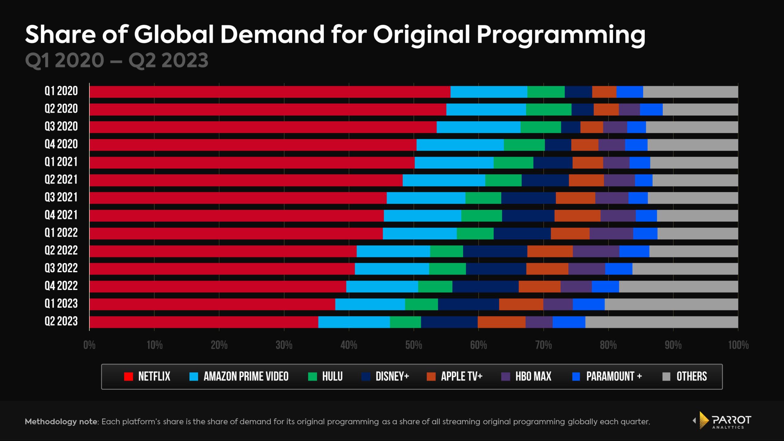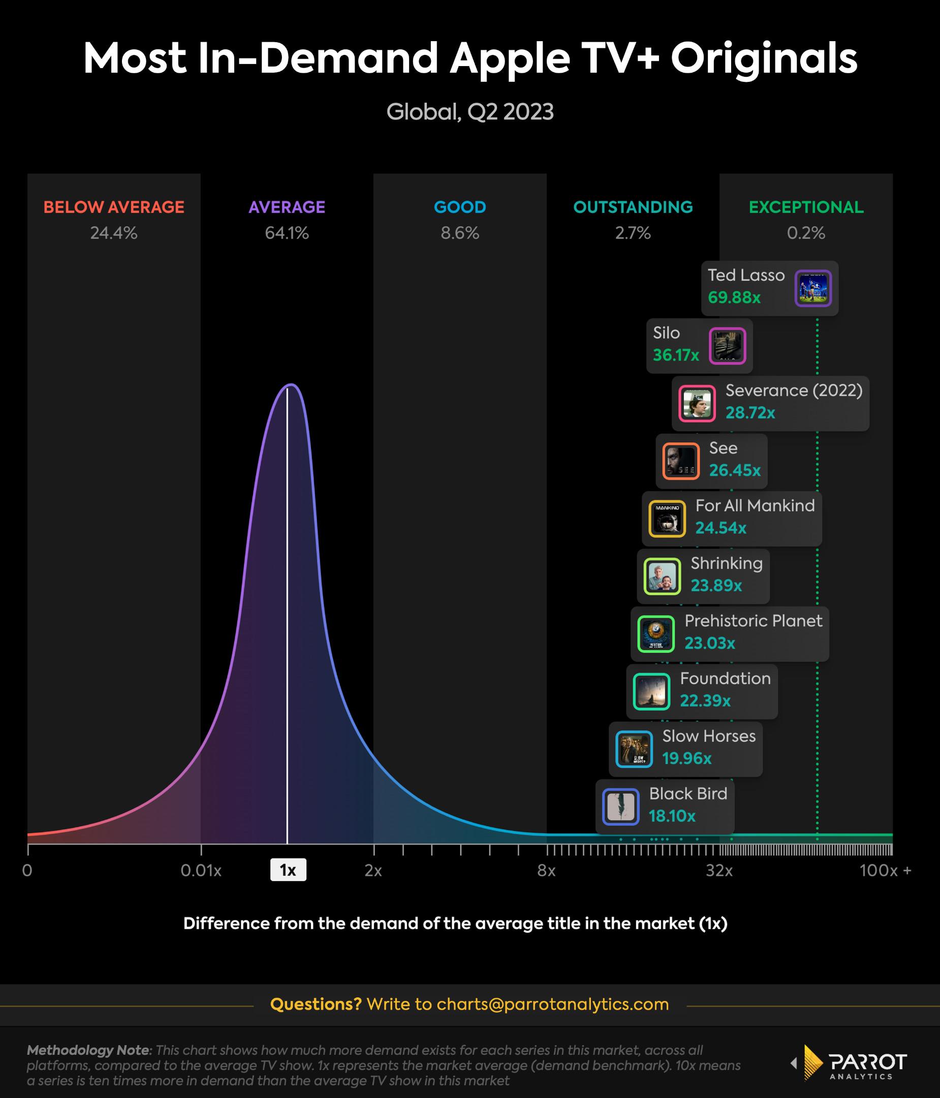 Katz offers a rosier report on Apple via Parrot’s holistic “demand” metric, which can isolate originals and, consequently, paints a picture of the service as “very much on a really, really cool roll.” According to Katz, Apple hit a record high in global demand share for originals in the second quarter, reaching fourth place among streamers behind Netflix, Prime Video, and Disney+.