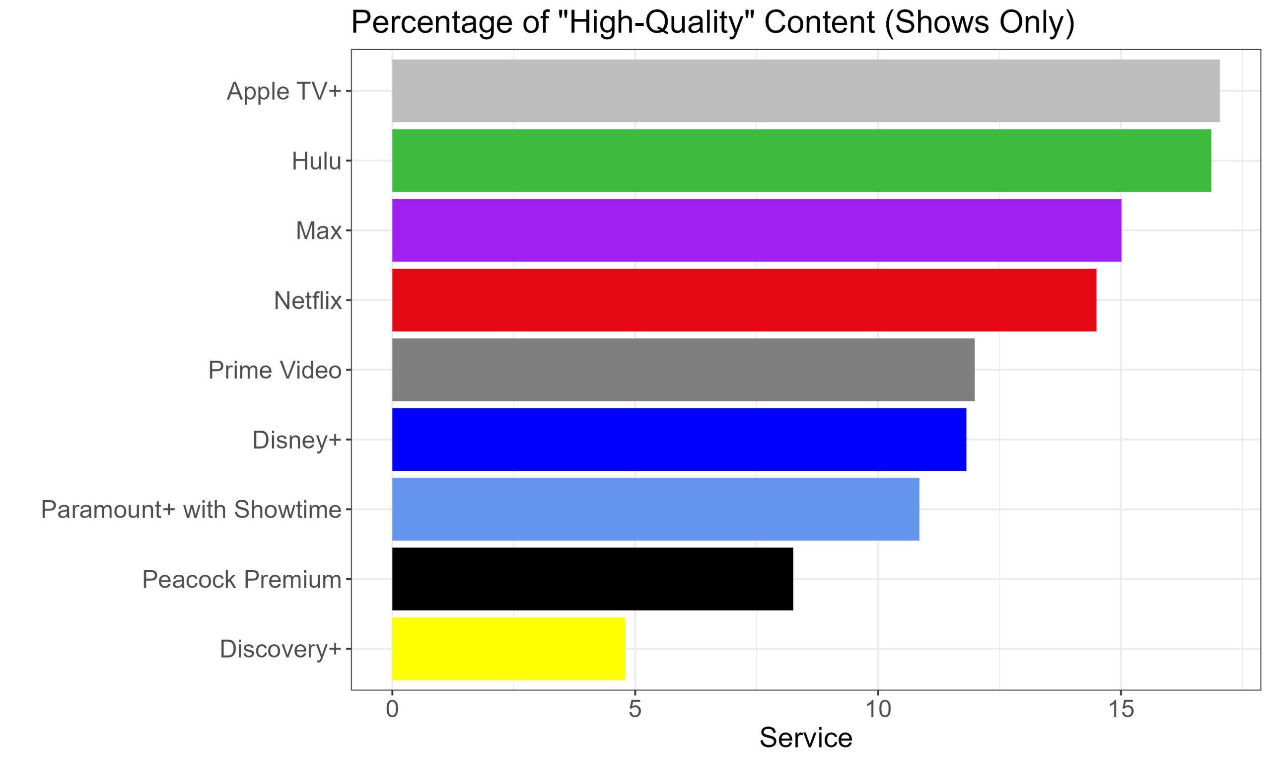 Similarly, data provided by streaming guide Reelgood shows that Apple TV+ leads the streaming pack in the percentage of its catalog considered “high quality,” which Reelgood classifies as anything with an IMDb rating of 7.5 or higher with at least 300 ratings. That holds true whether we look at movie and TV catalogs combined …