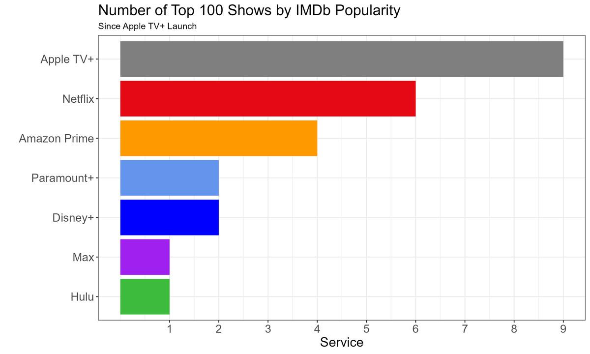 Here, it’s clear that Apple is punching above its weight on a rate basis. Its hit rate, or batting average, when it comes to highly rated series is far higher than Netflix’s, and it’s higher than or comparable to those of other services with fewer scripted originals than Apple. Apple also fares well if we look at the number of scripted shows for each streaming service in the current top 100 based on IMDb’s “popularity” score: