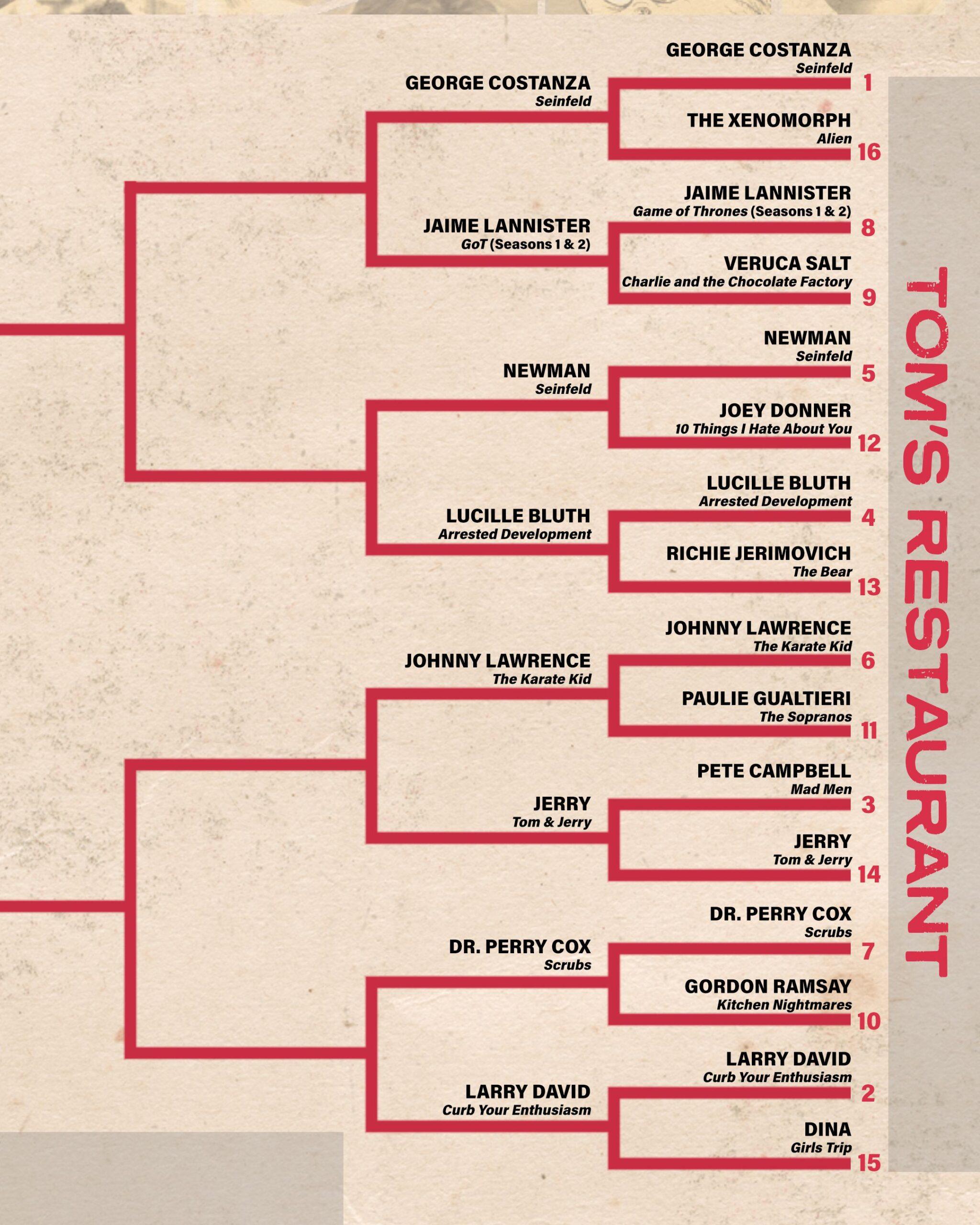 But things will get tougher now. LD can probably survive his matchup against Dr. Perry Cox, but 1-seed George finds himself in a surprisingly tough face-off against Seasons 1 and 2 Jaime Lannister while Newman is set to go head-to-head against Lucille Bluth. On Tuesday morning, it looks like a trophy might be coming to the Upper East Side, but by Wednesday, the region named after Seinfeld could be without any Seinfeld characters. (Not that there’s anything wrong with that.)