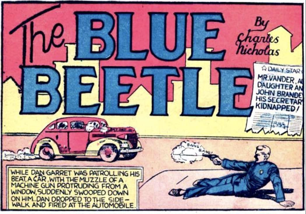 Blue Beetle made his first appearance as one of the many featured superheroes in Fox Comics’ Mystery Men Comics no. 1 in 1939. Created by writer-artist Charles Nicholas Wojtkoski, the original Blue Beetle couldn’t be more different from the iteration of the character that will appear on-screen in the upcoming film. In those early appearances, Blue Beetle was secretly a rookie police officer named Dan Garret, who switches into his alter ego by wearing a bulletproof costume and consuming the so-called Vitamin 2X drug to gain superpowers.