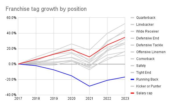 No other position has experienced anything even remotely similar. The franchise tag number for running backs has declined 16.7 percent in seven years, while the cap itself has gone up 34.6 percent. Even the kicking specialists have seen their franchise tag number grow by 11.4 percent since 2017. Here’s what that looks like visually: