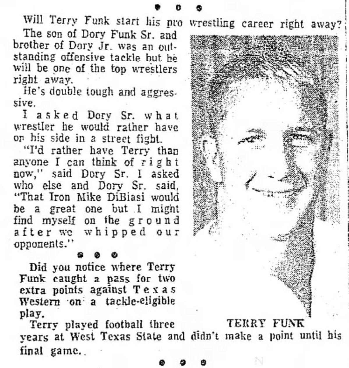 Wrestling defined Terry Funk’s life. His father, Dory Funk Sr., served as the promoter of the Amarillo territory in Texas and his brother, Dory Jr., preceded him in the ring and as holder of the NWA Worlds Heavyweight Championship. Dory Jr. also preceded him on the West Texas State University football field. A natural athlete, Terry more than held his own on the gridiron, but wrestling was in his blood: “I might have stayed [and finished my degree],” he wrote in his autobiography, Terry Funk: More Than Just Hardcore, “but I’d had a taste of my father’s territory for a few months. So I just said, ‘the hell with it,’ quit school, and never looked back.”