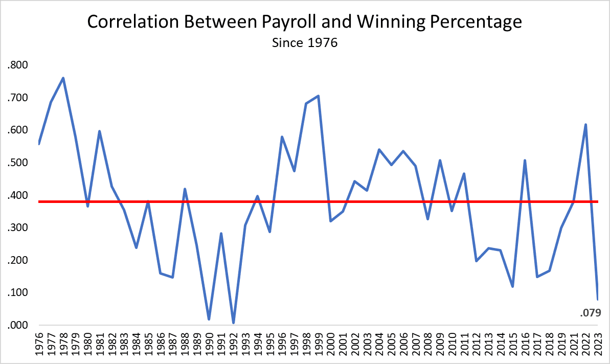 Payroll’s power to predict teams’ fortunes has ebbed and flowed over the past several decades. In the early years of free agency, when payrolls skyrocketed, the first movers that were willing to wade into the new market were rewarded with wins. That advantage wore off over the following decade, and the correlation between spending and winning faded further in the mid-1980s, when owners conspired to stop spending. In the late 1990s, big spenders dominated, which inspired panic about baseball economics and led to increased revenue sharing. Over the past dozen or so years, the connection between payroll and winning has tended to be weak (perhaps in part because embracing sabermetrics and data-driven development has helped some clubs ball on a budget), but from year to year, the correlations are still subject to sizable swings. Just last season, the link between spending and winning was abnormally robust.