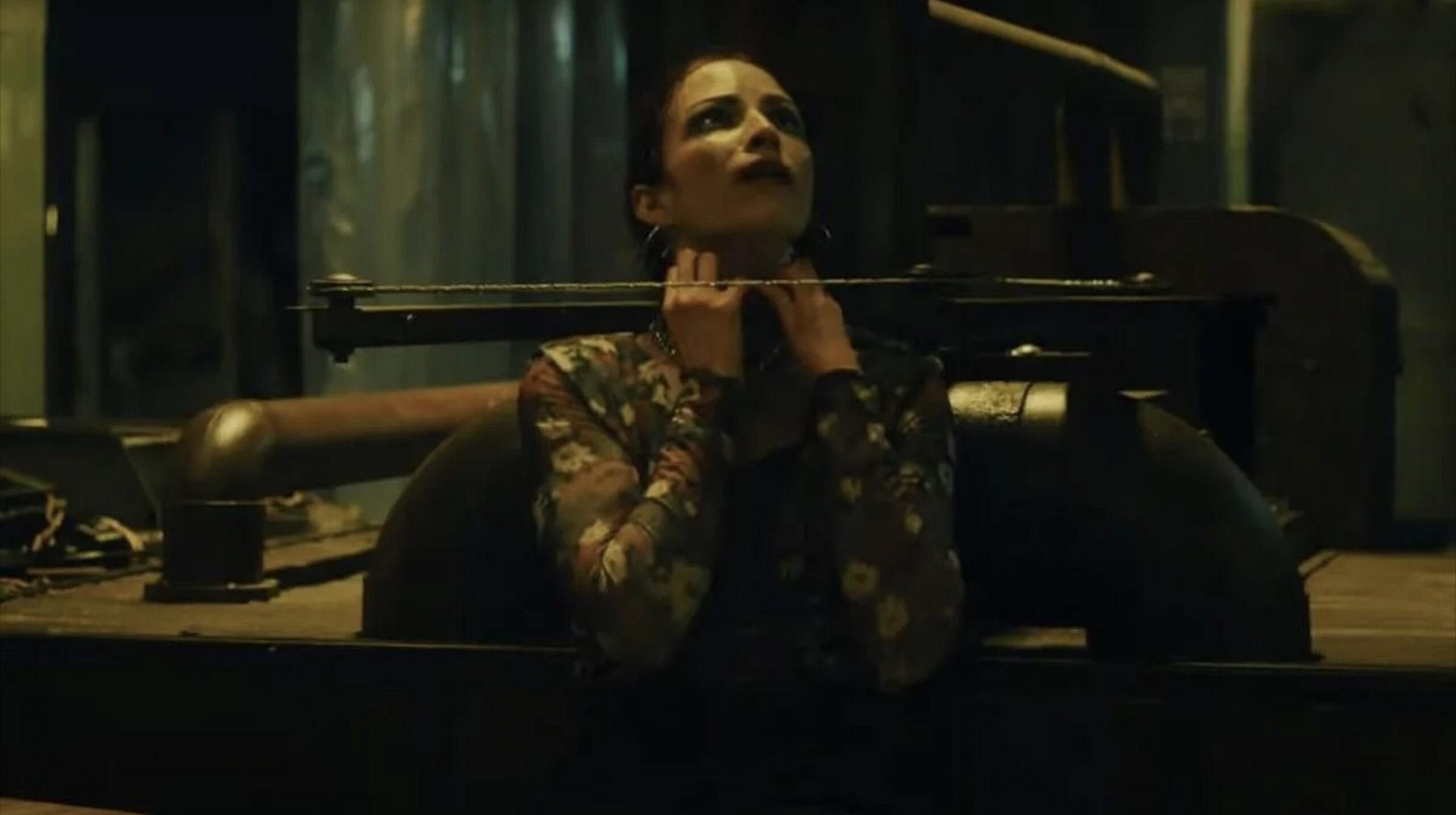 This is easily the best and least survivable trap in Saw X. Valentina has to use a Gigli saw to cut off her right leg along a line drawn across her upper thigh and shove a vacuum into her femur that will suck out blood and bone marrow. If three ounces of bone marrow—not blood, because blood leaks through holes in the customized scale’s surface—hits the scale before the three-minute timer is up, the saw wire across her neck won’t take off her head.