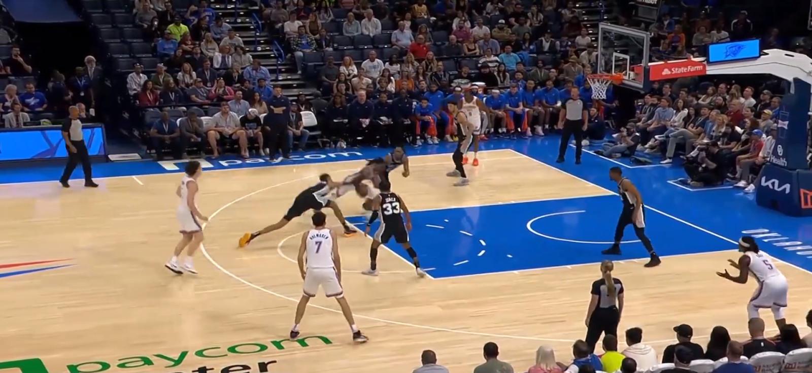 And for as McGrady-esque as Wembanyama might appear on offense, his defensive versatility was arguably the highlight of the entire game on Monday night. On a possession midway through the first quarter (which eventually led to a breakaway Wemby dunk), the 7-foot-4 Wembanyama stuck with Jalen Williams’s stuttering provocations in the corner, expertly contesting a badly missed stepback 3. Then, after Thunder rookie Cason Wallace grabbed the offensive rebound and pulled the ball out to reset, Wembanyama crowded Josh Giddey’s airspace beyond the arc. Wallace tried to take matters into his own hands by driving the ball, not realizing that in that same instance, Wemby would—or even could—flip his hips and dig at the ball, lunging after it with one foot planted at the top of the key and the other on the free throw line. Spurs point guard Tre Jones was ostensibly the help defender at the nail on the play, but Wemby’s preposterous length and flexibility allowed him to do Jones’s job—from damn near the 3-point line: