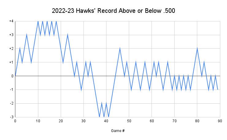 This graph shows how many games above or below .500 Atlanta was throughout last season, including playoffs. Note that the Hawks deviated from an even record by more than a game just once over the last half of the season (play-in and playoffs included).