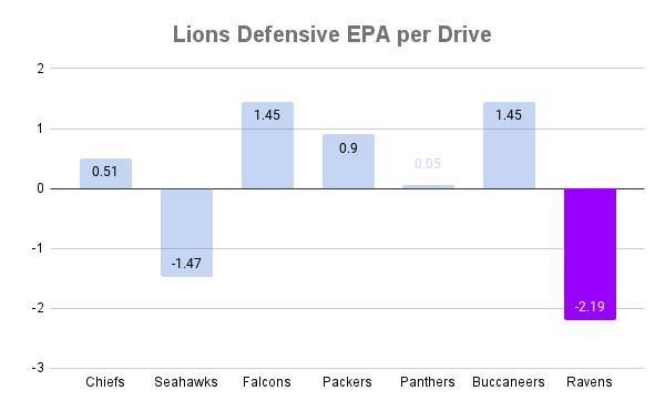 And what about the Lions, on whom the Ravens just consummately dunked? They’d be ranked eighth in EPA per drive without their matchup against the Ravens. Here’s their EPA per drive by game.
