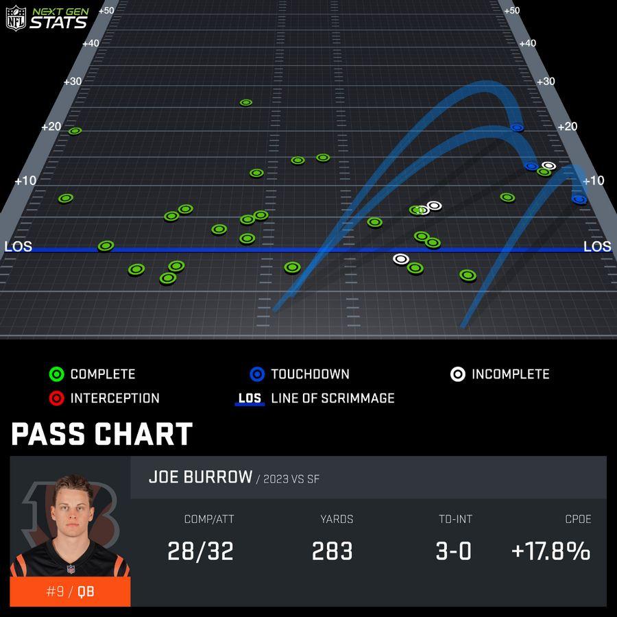 The soft run defense was an issue the 49ers saw coming after they got run over by Philadelphia in last year’s NFC title game. Trading for defensive tackle Javon Hargrave was supposed to solve the problem, but San Francisco has actually regressed in that area. That could be a sign that the team’s problems are a result of defensive structure rather than personnel. The 49ers are, for the most part, a “line up and play” defense. They don’t try to fool the offense as much as they just try to out-execute them, which is hard to do when offenses can reliably pick up 5 yards on first down—whether on the ground or with a quick pass underneath. The Bengals were able to do both on Sunday. The run game was productive all afternoon, and Burrow did this in the passing game:
