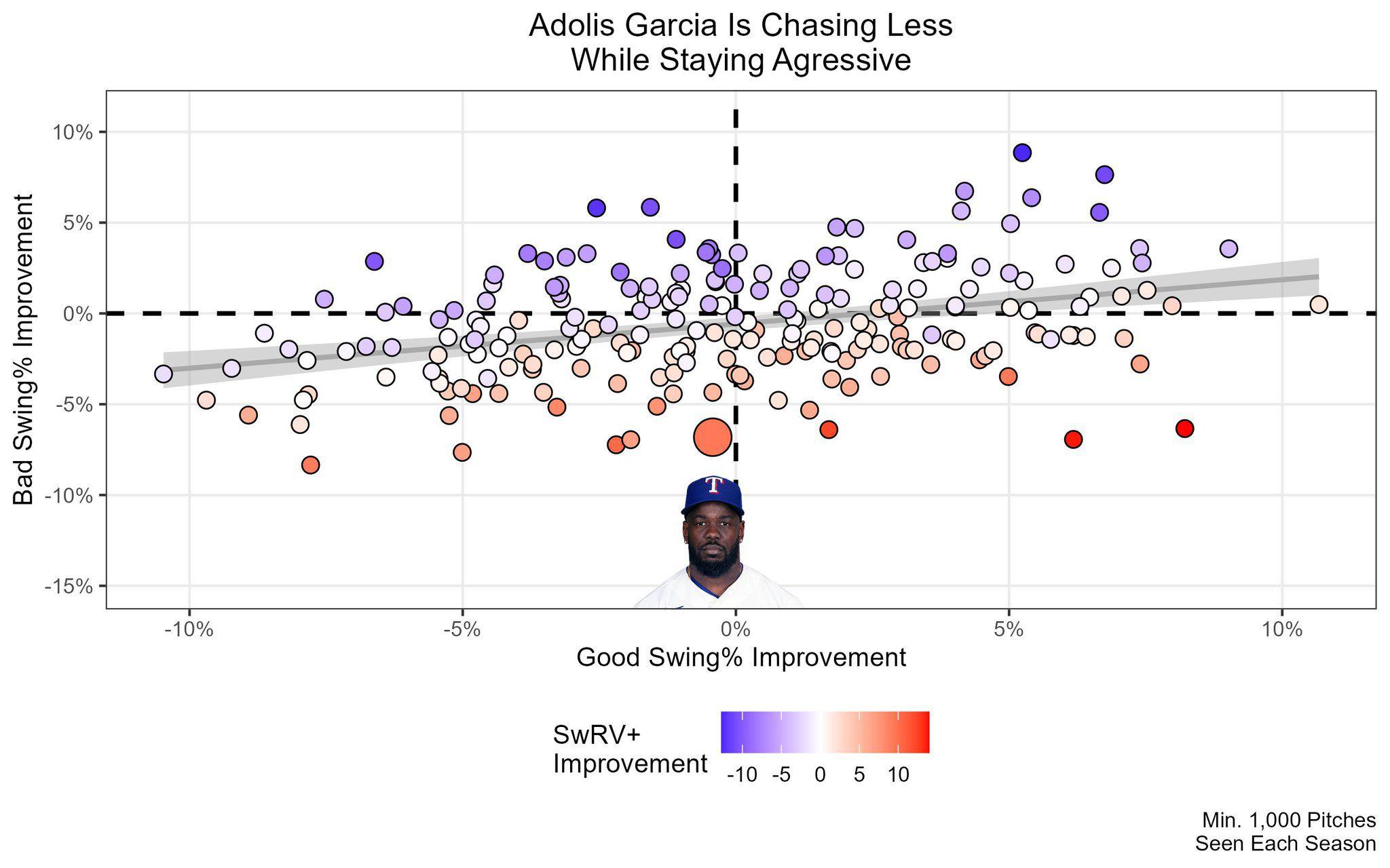 No trade acquisition blossomed in Texas more dramatically than playoff hero Adolis García, the ALCS MVP who hit a walk-off homer in Game 1 before hurting his oblique in Game 3 and being removed from the roster. The two-time All-Star’s feats of power were made possible by improvements in plate discipline that Texas encouraged: Among all players who saw at least 1,000 pitches in 2022 and 2023, García made the fifth-largest improvement in swing-decision metric SwRV+ by maintaining his aggressiveness on hittable pitches (81st percentile in 2022, 82nd in ’23) while significantly curtailing his tendency to chase (9th percentile in ’22, 46th percentile in ’23). García, who hit .323/.382/.726 with eight home runs and a playoff-record 22 RBI, finished 17th all-time in single-postseason win probability added and 11th all-time in single-postseason RE24 (three spots behind Seager’s 2020 and one behind Seager’s 2023).