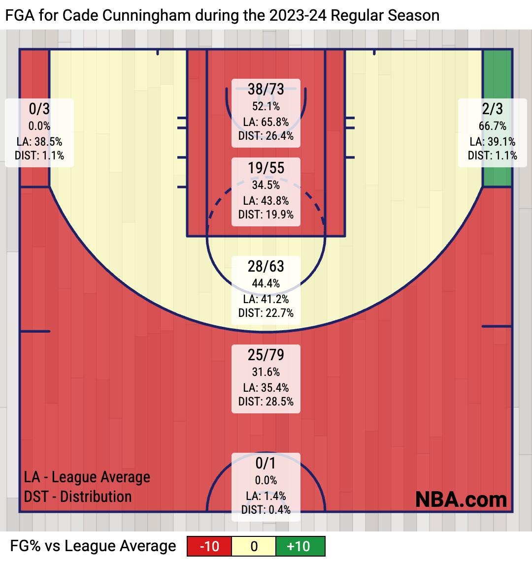 As the past decade of basketball evolution demonstrates, there are three ways to score efficiently in the NBA (layups, 3s, and free throws) versus one way to score inefficiently (via the midrange). But look at Cade’s shot chart this season—he’s decent from only the midrange and below average at the rim, from floater range, and beyond the arc.