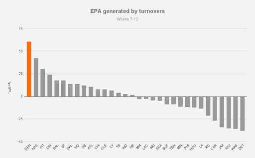 Since Week 7, the Broncos have taken the ball away from their opponents 16 times; they’ve given it back only three times. A plus-13 turnover differential is wild—five more than second place (the Giants, at plus-eight, a number inflated by a 6-0 turnover game against the Commanders) and more than double that of third place (the Steelers and Ravens, both at plus-six). Consider the total EPA generated by turnovers, which contextualizes not just how many giveaways and takeaways happen, but how much they actually affect a team’s win probability.