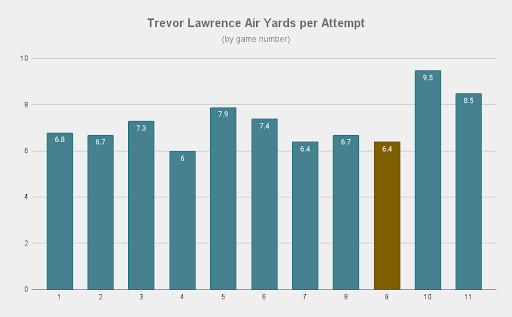 I defended Lawrence in this column that week and put the brunt of the blame on the shoulders of offensive coordinator Press Taylor. One of my biggest complaints was how shallow the offense was. Lawrence was averaging 6.9 air yards per attempt, one of the lowest numbers in the league, and it was a function of design: No team was running shallower routes than the Jaguars.