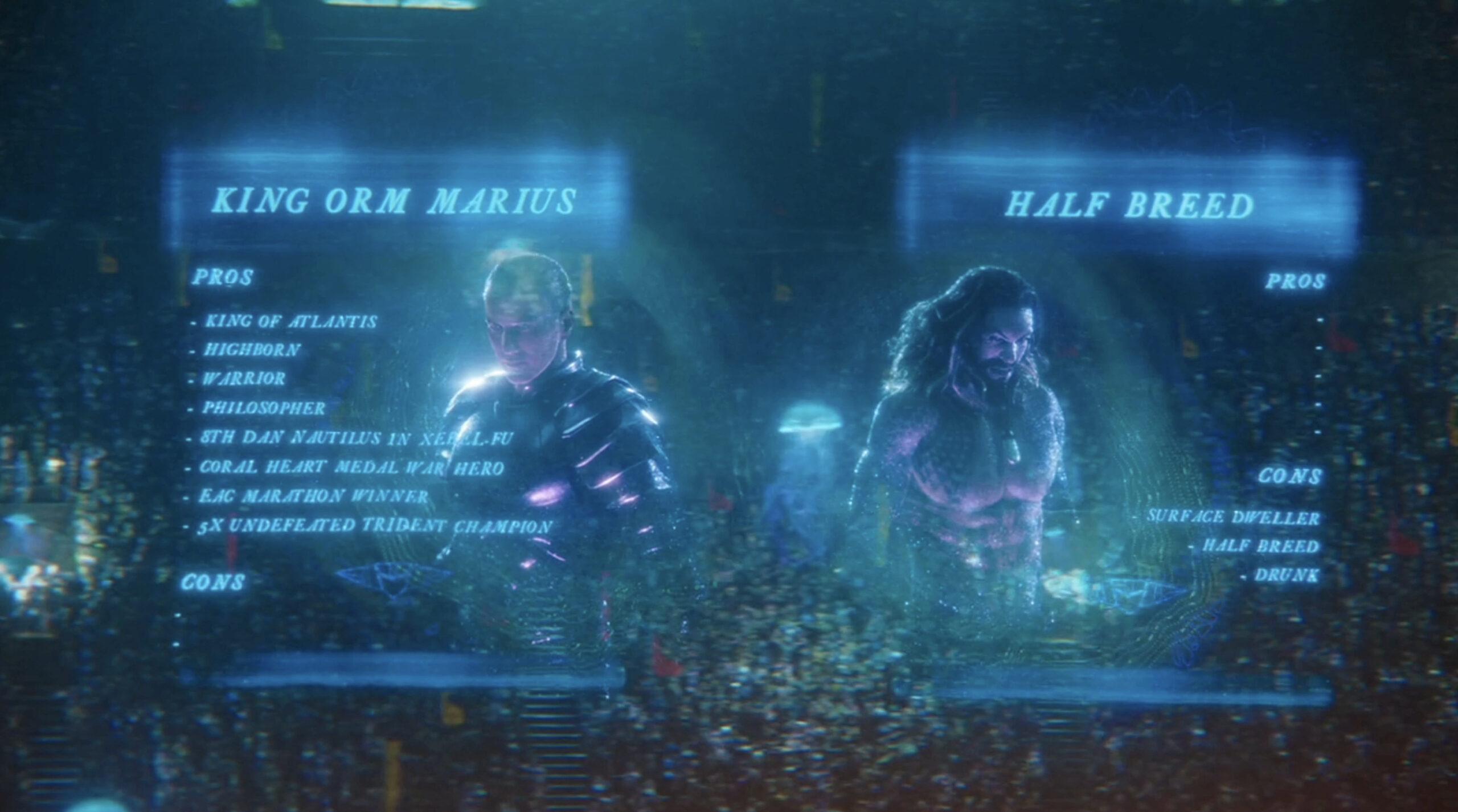 Sticking with Atlantis, here’s how Arthur and his half brother, King Orm (Patrick Wilson), are described to the coliseum’s attendees before their epic showdown: