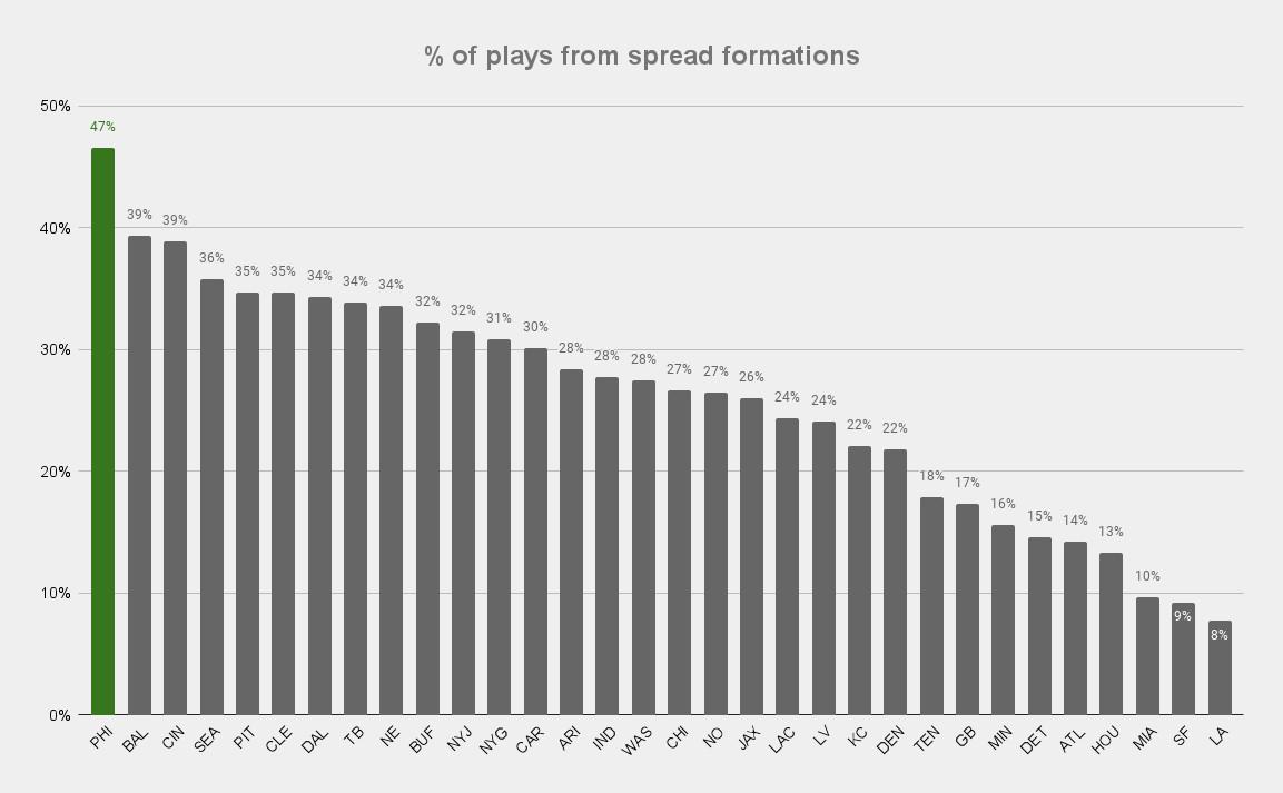 Now, it’s worth noting right away: They were very, very good on offense last year, and they didn’t really have a system then either. The 2022 Eagles ran a shockingly small number of plays from a shockingly small number of formations. It’s hard to describe this in its entirety with catchall data because formations are so varied across the league, but we can use a few cases as examples.