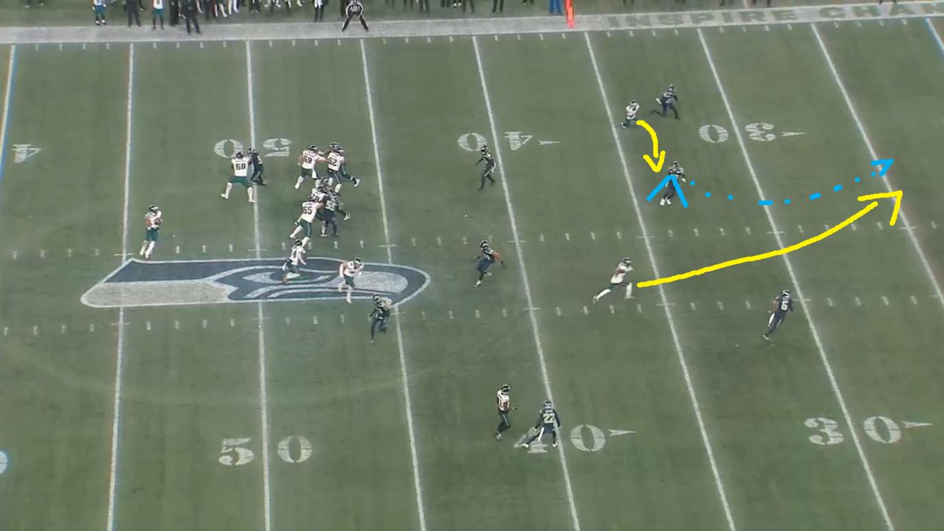 How did this happen? To start, the Eagles ran some pre-snap motion, and they got the desired effect out of it! It caused some confusion in the Seahawks secondary. Cornerback Artie Burns thought he could pass the motion off to a different player, but he’s supposed to be in man coverage and was late to follow the motion across. Accordingly, when the ball is snapped and Burns becomes responsible for Smith in man coverage, he is not prepared to play coverage, and Smith runs away from him easily.