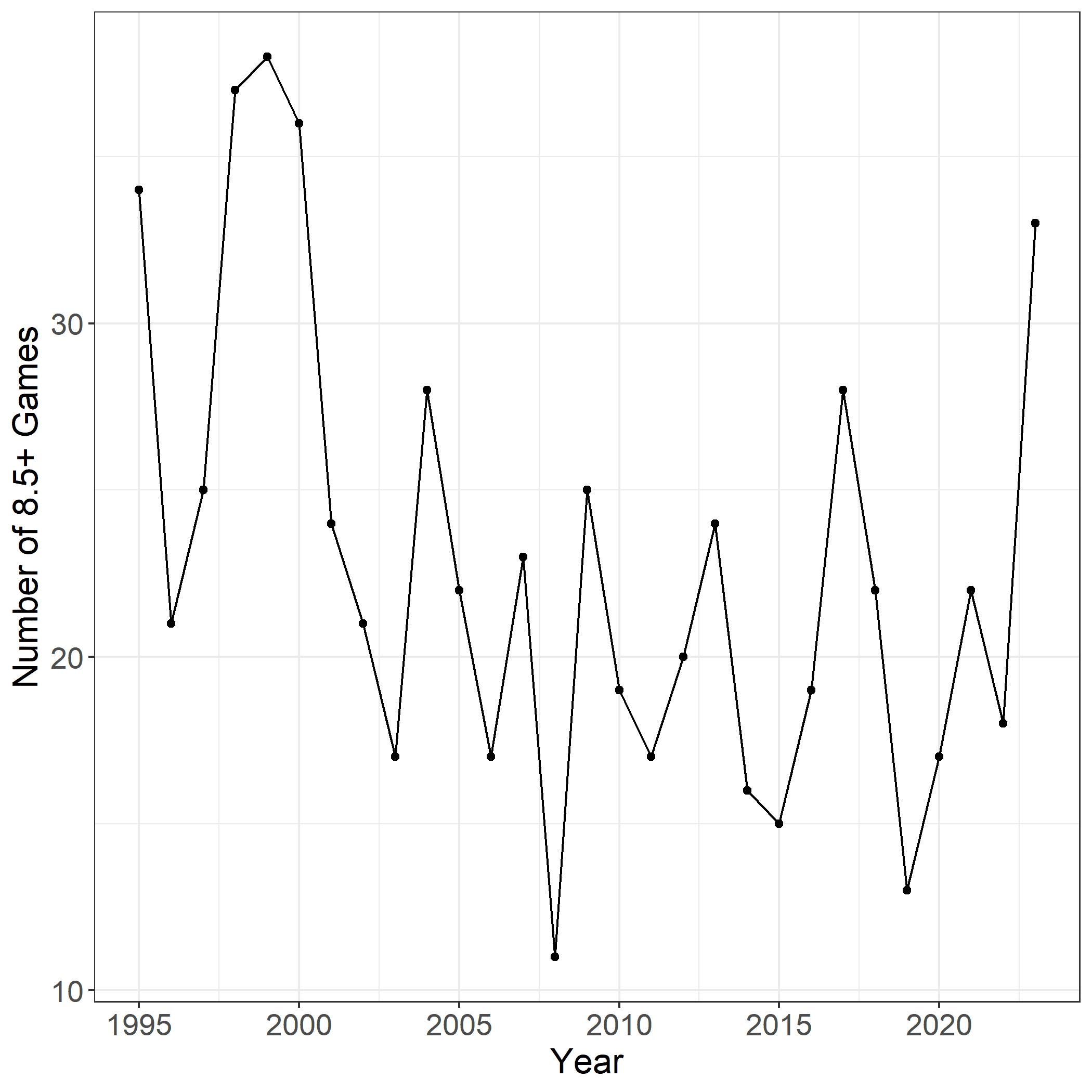 This year also leads if our sample includes all games with 8-plus or 9-plus scores (not just the top 10, 25, or 50), even if we limit to non-remakes, non-remasters, and non-expansions: