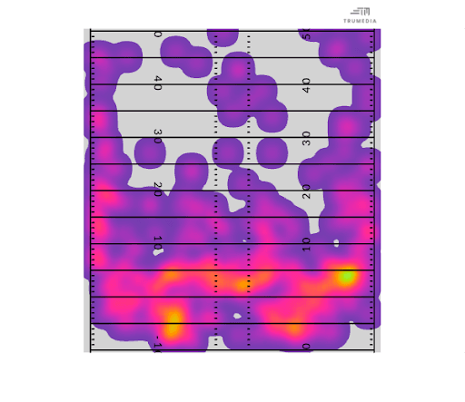 Payton’s offensive philosophy this season has been whatever the opposite of letting Russ cook is: handoffs and short screen passes behind the line of scrimmage, with just enough deep shots to keep things interesting. Wilson’s 2023 passing heat map illustrates how rarely he’s attempted passes in the intermediate middle of the field, and how heavily Payton has called for high-percentage, short-yardage throws: