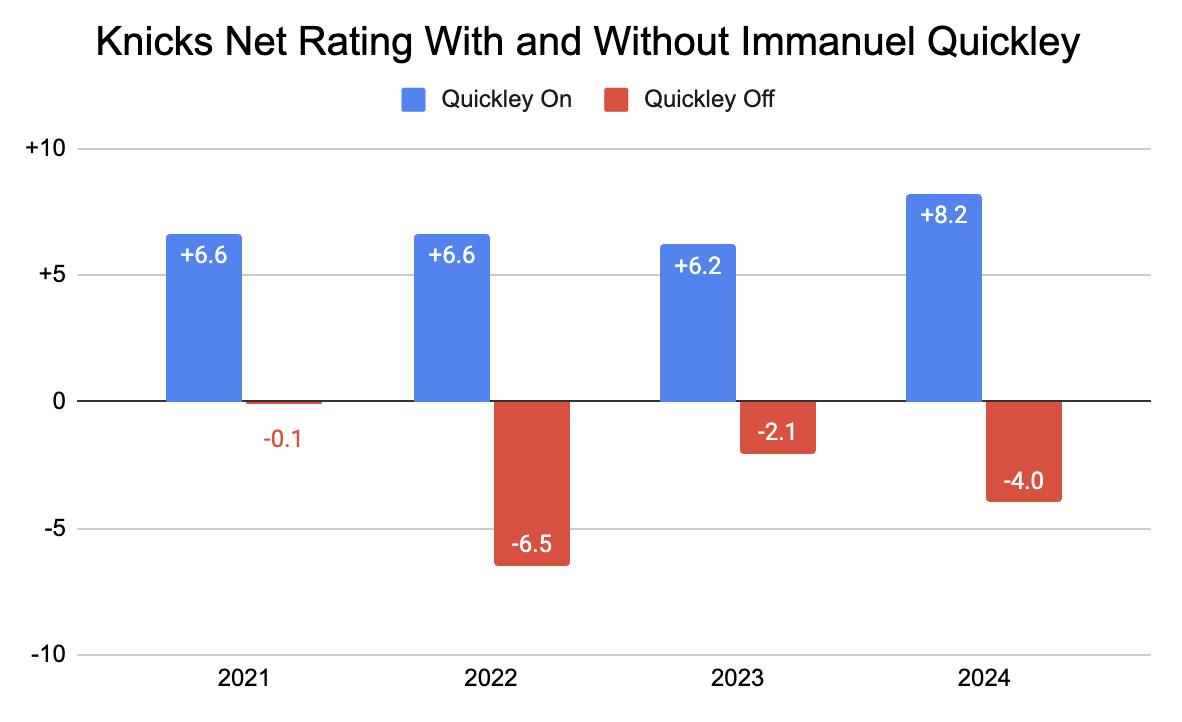 Second, New York loses Quickley without—no offense to Malachi Flynn—a ready replacement for his juice off the bench. In a narrow context, maybe this loss is acceptable because it was clear that Quickley had fallen out of the Knicks’ long-term plans, after he didn’t sign an extension last summer. But in every season of his career, the Knicks have had a very good net rating when he’s been on the court and a negative net rating with him off, so they might end up regretting the loss of last season’s Sixth Man runner-up.