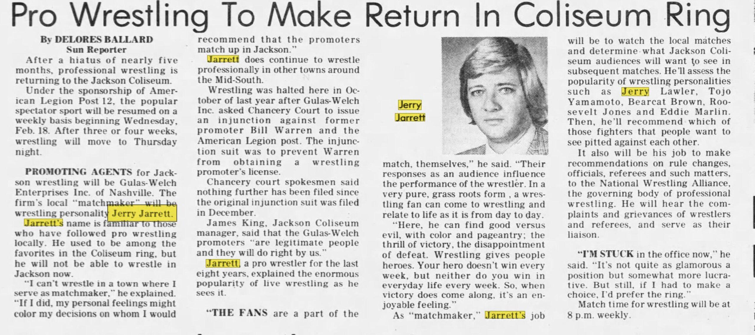 After gaining additional experience as a booker in the Atlanta territory, Jarrett grew increasingly concerned about the state of the Gulas territory. According to Lawler, Nick Gulas had begun using his tall, somewhat ungainly son, George Gulas, as a major attraction even though George didn’t have sufficient training to perform in the role, and gate revenues were declining accordingly.