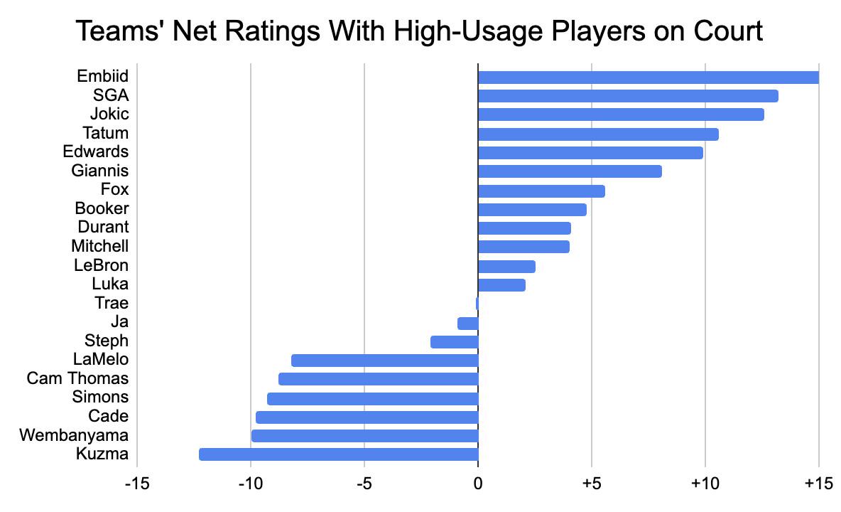This chart shows the on-court net rating for the highest-usage players this season. There’s a clear pattern: The best teams—the teams on track to win 50-plus games, which is the pace Memphis needs to maintain the rest of the way—overwhelmingly win the minutes with their brightest star on the court. The 76ers are plus-15 with Embiid, the Thunder and Nuggets are plus-13 with SGA and Jokic, respectively, and so on.