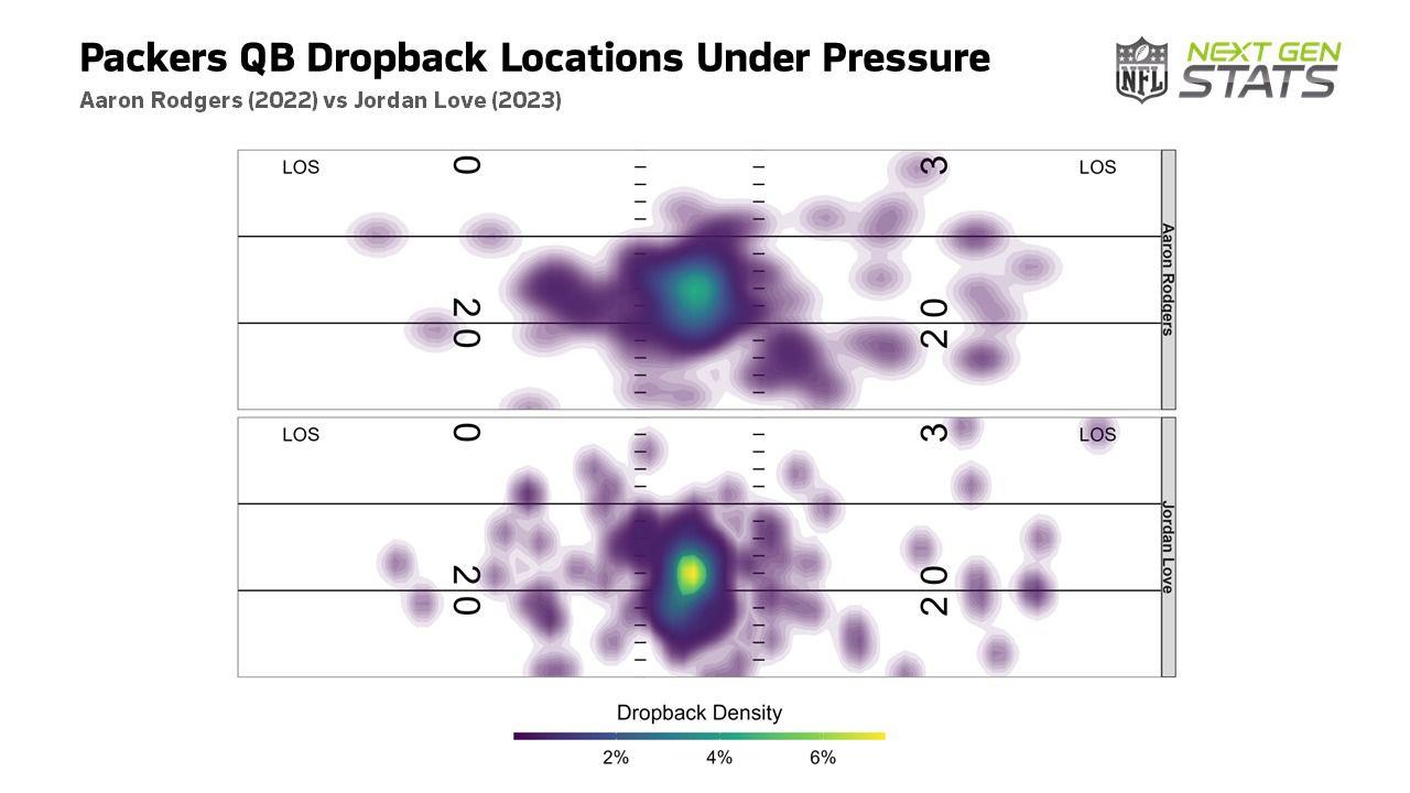 At 25 years old, Love is more spry than Rodgers was last season, so it may not come as a surprise that the younger quarterback is performing better with defenders chasing. But more mobility doesn’t fully explain the gap in their respective performances. As you can see in this heat map from Next Gen Stats, most of Love’s pressured attempts have been concentrated in the center of the pocket, while Rodgers’s were more scattered.
