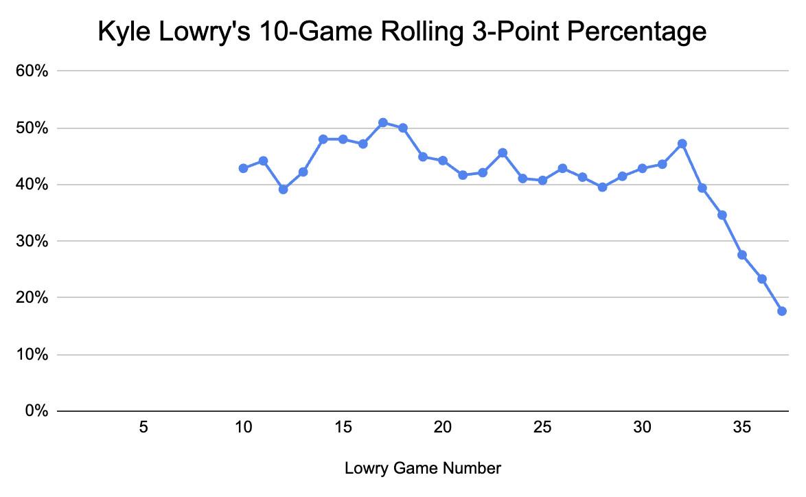 Lowry started this season on fire from distance, albeit at middling volume, but his performance has cratered recently. In nine games in January, he’s averaged only 4.4 points per game on 29 percent shooting (16 percent on 3-pointers). That’s a small sample, but also a continuation of Lowry’s late-career progression. He came off the bench in his past two games, as Erik Spoelstra started bigger lineups—with Adebayo, Butler, Caleb Martin, and Nikola Jovic next to just one guard, Herro—instead.
