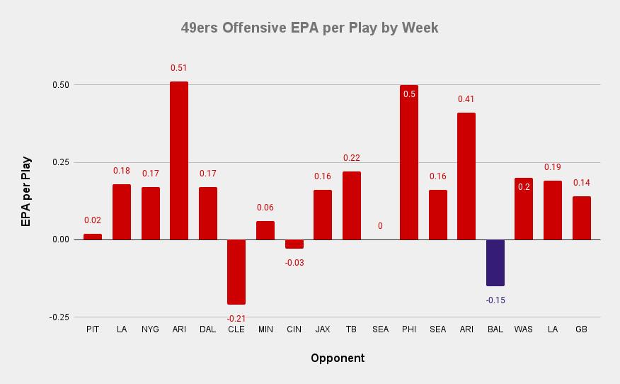 The Miami Dolphins led the league in pre-snap motion rate—they were the only team in the league to send a player in motion on more than 80 percent of their offensive plays. Here’s their EPA per play by game this season, with their games against the Ravens and Chiefs highlighted.