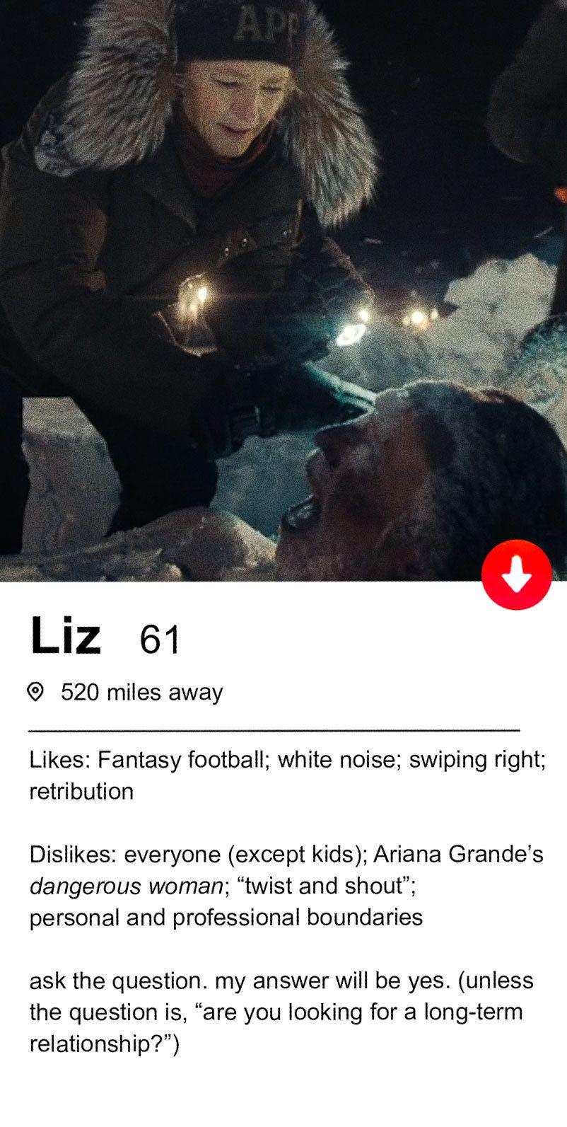 I’d love to get a look at Liz’s Tinder bio. Here’s how I picture it: