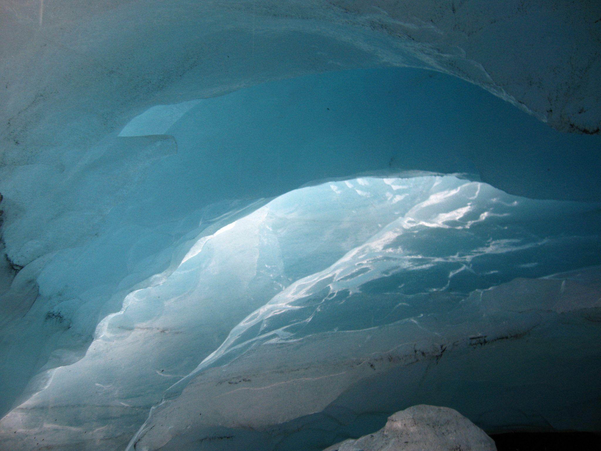 After a few minutes, we got curious and squeezed through, into a cave about the size of a one-bedroom apartment, tucked under many tons of glacier ice. Inside, it was stunning; the blue was deep, the air even chillier. The inside of an ice cube. We had never done anything like this before.