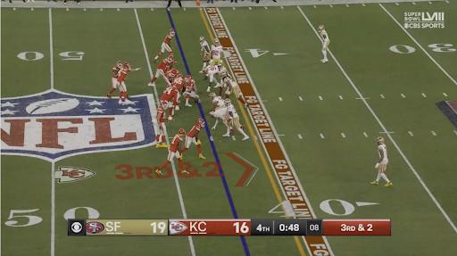One play in particular stands out: a third-and-2, down three with 48 seconds left. The 49ers were showing Mahomes an all-out pressure look—the sort of look in seasons past that Mahomes the magician might have looked at with greedy eyes. A one-on-one shot downfield against man coverage with no safety help? This could be the game-winning play.