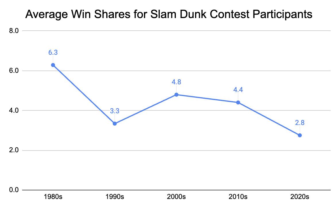 But as a multi-season group, recent dunk contest fields indeed register as the worst ever, with only the groups of the 1990s coming close. (For this graph, stats collected over shorter seasons were prorated to 82 games.)