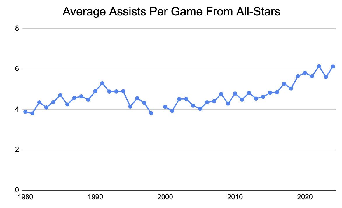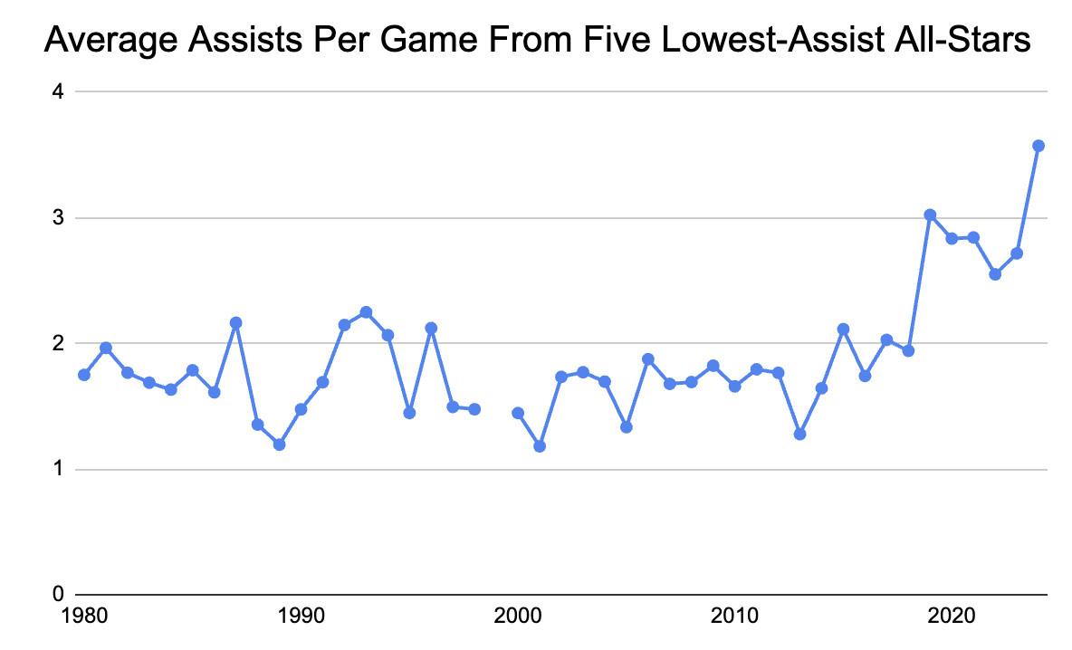 Of the 26 All-Stars overall—starters, reserves, or injury replacements—25 are averaging at least 3.6 assists per game. Only Towns, at 2.9, is below that number. A decade ago, for comparison, seven 2013-14 All-Stars were averaging fewer than three assists per game. Two decades ago, nine 2003-04 All-Stars were. As this chart shows, current All-Stars are collectively averaging more assists than ever.