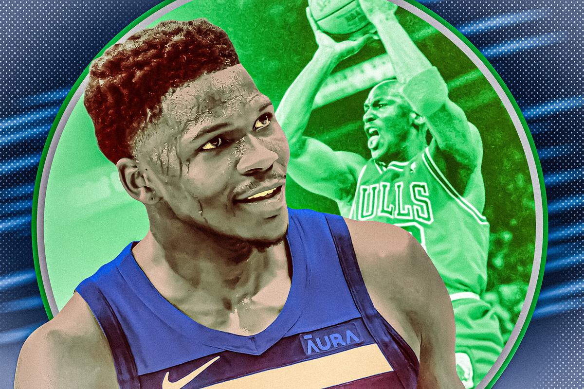 Though, admittedly, it’s impossible to ignore the visual. The split-face portrait of Edwards stitched to that of a young Jordan began circulating social media at some point in early 2021, during Ant’s rookie season. You know the one. Stare at it cross-eyed for long enough and a coherent profile coalesces—the downward cast of their eyes, the shape of their noses, their natural smiles. Three years later, not a game goes by without someone tweeting the same joke about how convinced they are that Edwards is Jordan’s son. (Should you need further evidence, here is “Anthony Edwards Being Michael Jordan’s Son for 10 Minutes Straight.”)