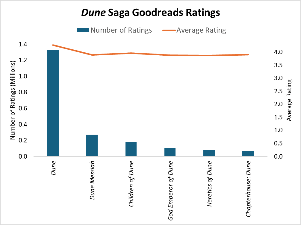 Dune may be a masterpiece, but the series gets progressively less accessible as its lore accumulates. The number of Goodreads ratings gives us some indication of the precipitous decline in popular awareness of the series beyond the first book.